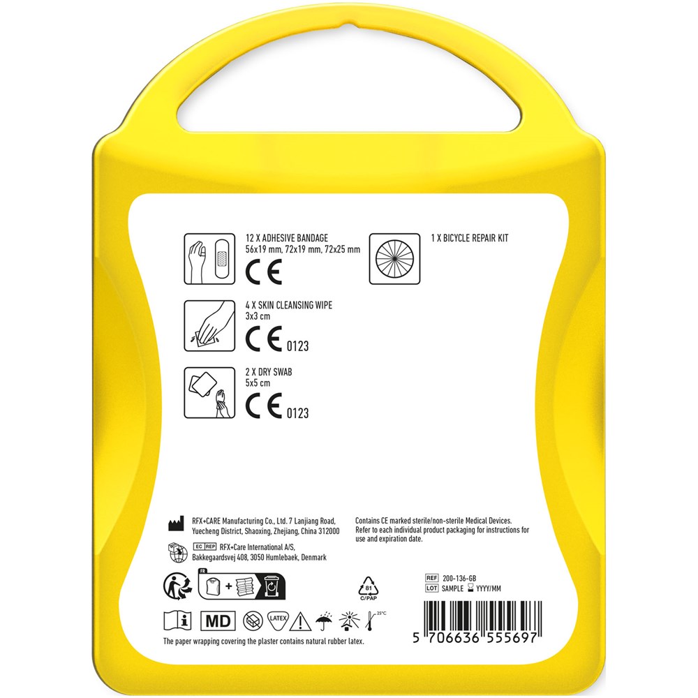 Ideales Set für jede Fahrradtour. Seien Sie gut vorbereitet bei kleinen Verletzungen und einem platten Reifen. Inhalt: 12 wasserfeste Pflaster, 4 hautreinigende Tupfer, 2 Trockentupfer, 1 Reparaturset. Alle im Set enthaltenen Erste-Hilfe- und Pflegeprodukte erfüllen alle geltenden EU-Vorschriften. Preis inkl. vollfarbigem Druck.