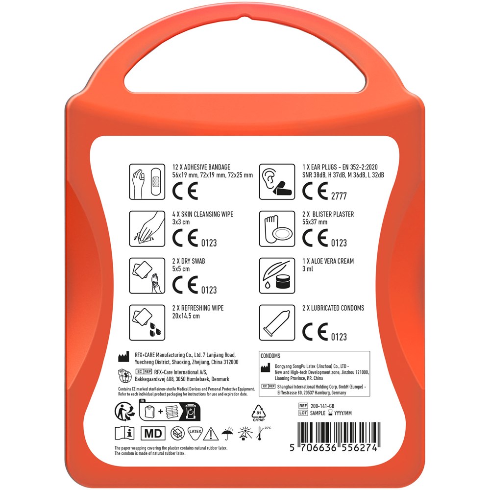 Ideales Erste-Hilfe Set für jedes Festival. Mit diesem Set sind Sie auf alles gut vorbereitet während eines Festivals. Inhalt: 12 wasserfeste Pflaster, 4 hautreinigende Tupfer, 2 Trockentupfer, 2 Reinigungstücher, 2 Kondome, 2 Blasenpflaster, 1 Aloe Vera Creme, 2 Ohrstöpsel. Alle im Set enthaltenen Erste-Hilfe- und Pflegeprodukte erfüllen alle geltenden EU-Vorschriften. Preis inkl. vollfarbigem Druck.