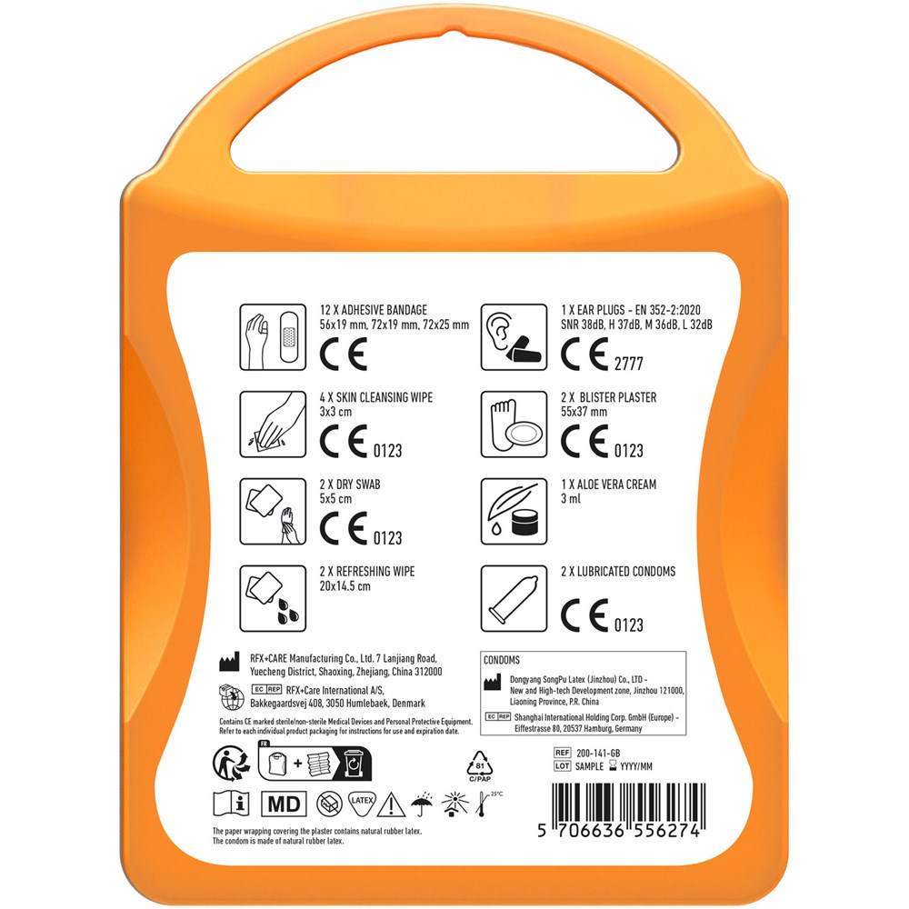 Ideales Erste-Hilfe Set für jedes Festival. Mit diesem Set sind Sie auf alles gut vorbereitet während eines Festivals. Inhalt: 12 wasserfeste Pflaster, 4 hautreinigende Tupfer, 2 Trockentupfer, 2 Reinigungstücher, 2 Kondome, 2 Blasenpflaster, 1 Aloe Vera Creme, 2 Ohrstöpsel. Alle im Set enthaltenen Erste-Hilfe- und Pflegeprodukte erfüllen alle geltenden EU-Vorschriften. Preis inkl. vollfarbigem Druck.