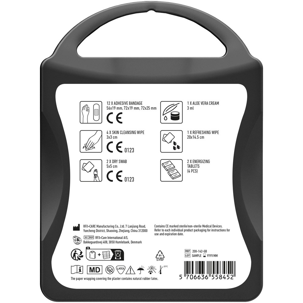 Ideales Set für neue Energie. Mit diesem Set können Sie sich erfrischen sowie neue Energie zuführen und Sie sind gut vorbereitet bei kleinen Unfällen oder Verletzungen. Inhalt: 12 wasserfeste Pflaster, 2 Täfelchen Traubenzucker (4 Stück), 1 Reinigungstuch, 1 Aloe Vera Creme, 4 hautreinigende Tupfer, 2 Trockentupfer. Alle im Set enthaltenen Erste-Hilfe- und Pflegeprodukte erfüllen alle geltenden EU-Vorschriften. Preis inkl. vollfarbigem Druck.