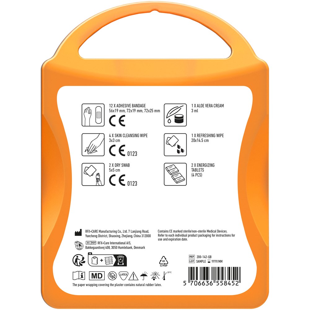 Ideales Set für neue Energie. Mit diesem Set können Sie sich erfrischen sowie neue Energie zuführen und Sie sind gut vorbereitet bei kleinen Unfällen oder Verletzungen. Inhalt: 12 wasserfeste Pflaster, 2 Täfelchen Traubenzucker (4 Stück), 1 Reinigungstuch, 1 Aloe Vera Creme, 4 hautreinigende Tupfer, 2 Trockentupfer. Alle im Set enthaltenen Erste-Hilfe- und Pflegeprodukte erfüllen alle geltenden EU-Vorschriften. Preis inkl. vollfarbigem Druck.