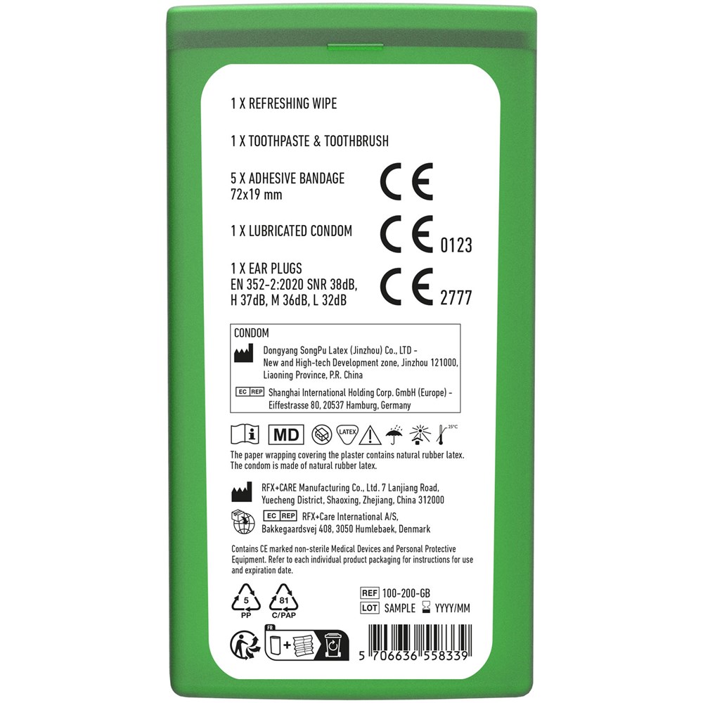Ideales Reiseset für Festivals und es enthält alle Dinge für eine Übernachtung. Das Set kann leicht in der Tasche verstaut werden. Inhalt: 1 Zahnbürste, 1 Zahnpasta, 2 Ohrstöpsel, 1 Desinfektionsgel, 5 wasserfeste Pflaster, 1 Kondom. Alle im Set enthaltenen Erste-Hilfe- und Pflegeprodukte erfüllen alle geltenden EU-Vorschriften. Preis inkl. vollfarbigem Druck.