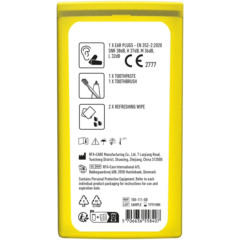 Ideales Reiseset für jede Reise. Mit diesem Set können Sie sich entspannen und erfrischen, sodass Sie entspannt am Ankunftsort ankommen. Das Set kann leicht in der Tasche verstaut werden. Inhalt: 1 Zahnbürste, 1 Zahnpasta, 2 Ohrstöpsel, 2 Reinigungstücher. Alle im Set enthaltenen Erste-Hilfe- und Pflegeprodukte erfüllen alle geltenden EU-Vorschriften. Preis inkl. vollfarbigem Druck.