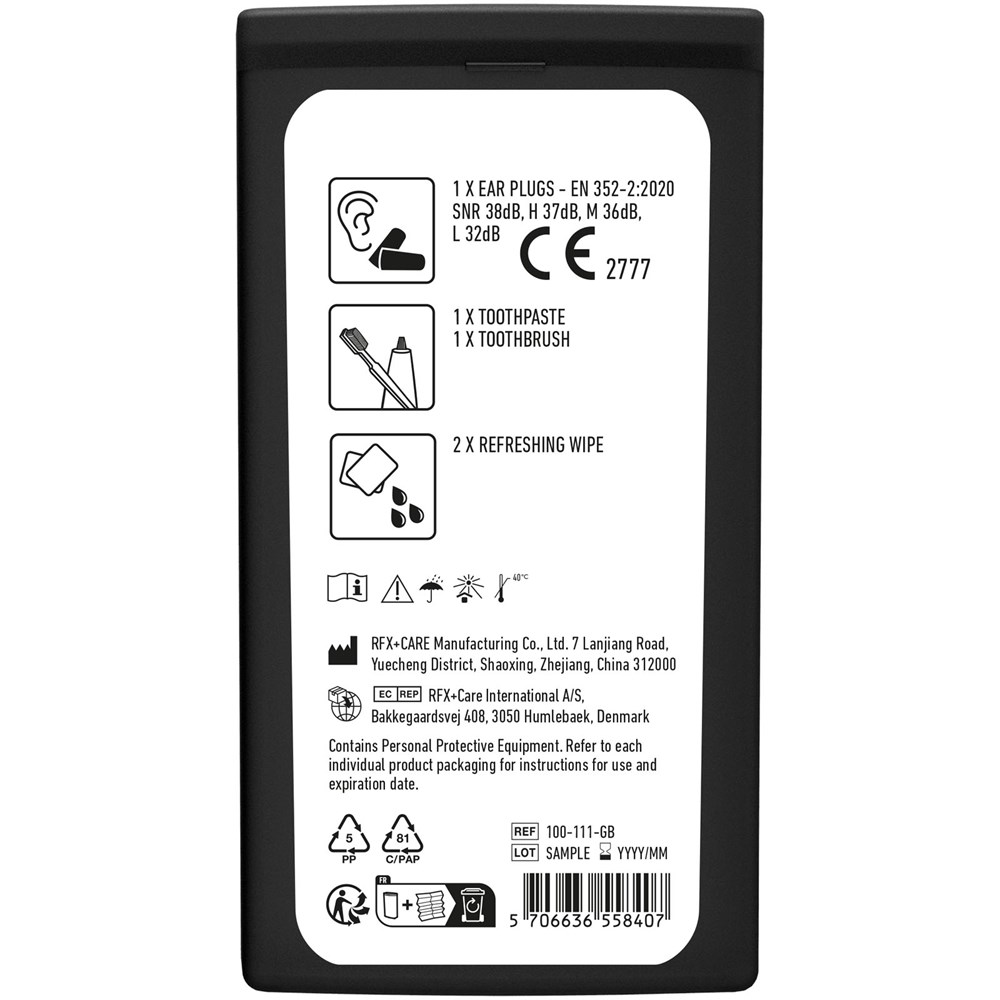 Ideales Reiseset für jede Reise. Mit diesem Set können Sie sich entspannen und erfrischen, sodass Sie entspannt am Ankunftsort ankommen. Das Set kann leicht in der Tasche verstaut werden. Inhalt: 1 Zahnbürste, 1 Zahnpasta, 2 Ohrstöpsel, 2 Reinigungstücher. Alle im Set enthaltenen Erste-Hilfe- und Pflegeprodukte erfüllen alle geltenden EU-Vorschriften. Preis inkl. vollfarbigem Druck.
