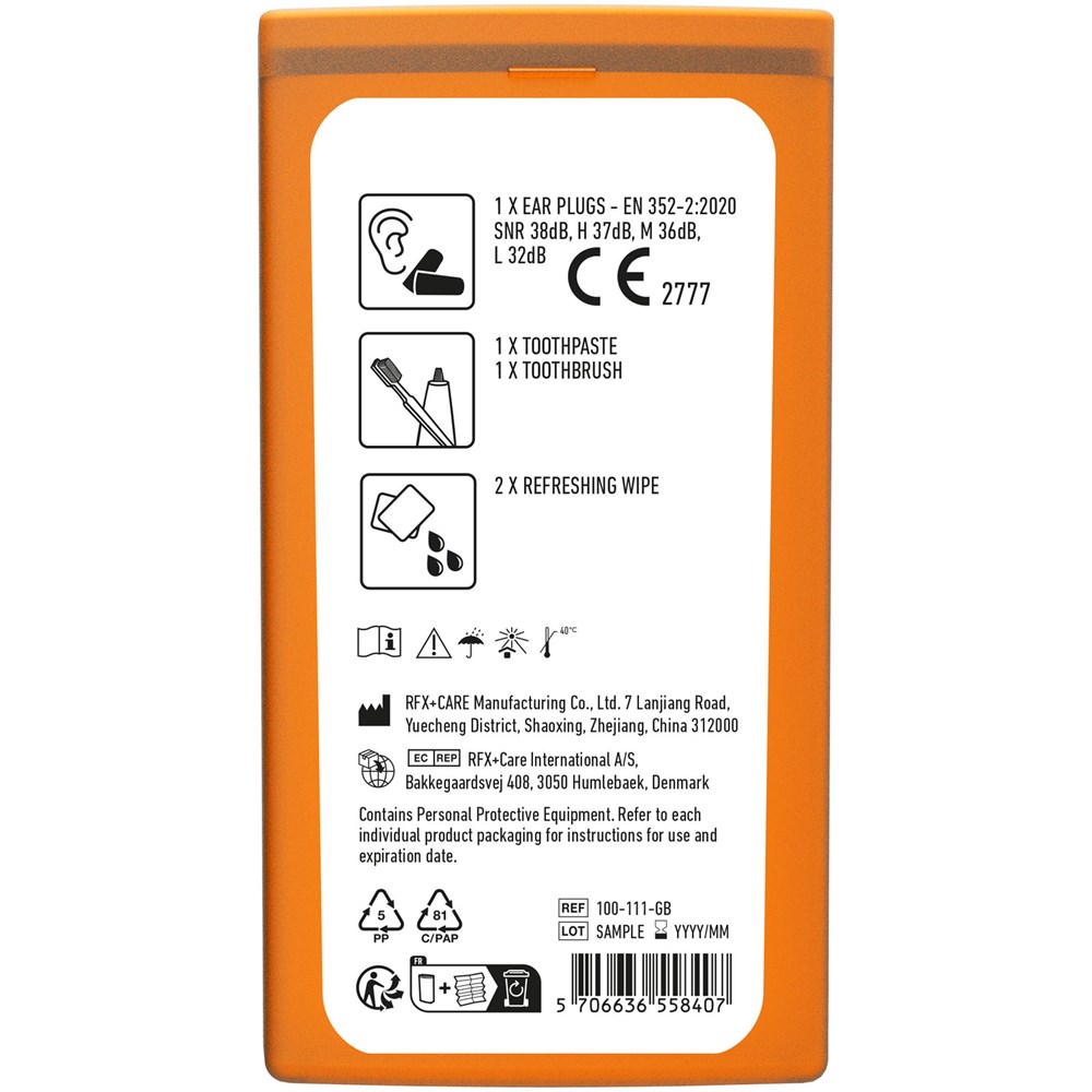 Ideales Reiseset für jede Reise. Mit diesem Set können Sie sich entspannen und erfrischen, sodass Sie entspannt am Ankunftsort ankommen. Das Set kann leicht in der Tasche verstaut werden. Inhalt: 1 Zahnbürste, 1 Zahnpasta, 2 Ohrstöpsel, 2 Reinigungstücher. Alle im Set enthaltenen Erste-Hilfe- und Pflegeprodukte erfüllen alle geltenden EU-Vorschriften. Preis inkl. vollfarbigem Druck.