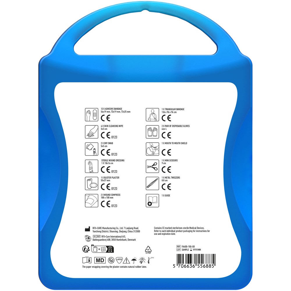 Dieses umfangreiche Erste-Hilfe Set ist ein handliches Set für Ihrem Haushalt um Verletzungen und Unfälle zu behandeln. Inhalt: 1 Erste-Hilfe-Leitfaden, 1 Blasenpflaster, 12 wasserfeste Pflaster, 1 Metall Pinzette, 1 Schere, 1 Dreieckstuch, 1 Paar Einmalhandschuhe, 2 Wundkompressen, 1 steriler Wundverband, 2 Trockentupfer, 4 hautreinigende Tupfer, 1 Mund-zu-Mund-Schutz. Alle im Set enthaltenen Erste-Hilfe- und Pflegeprodukte erfüllen alle geltenden EU-Vorschriften. Preis inkl. vollfarbigem Druck.