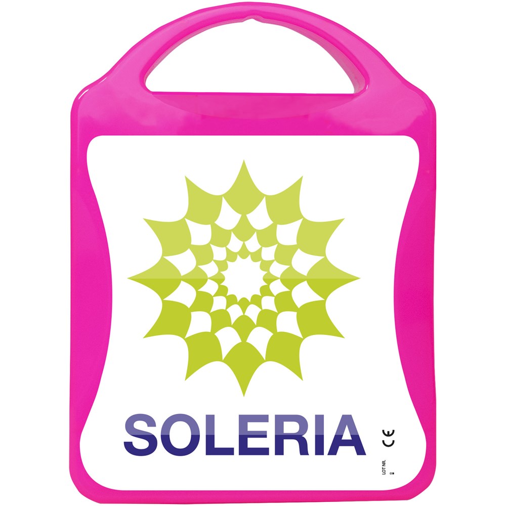 Dieses umfangreiche Erste-Hilfe Set ist ein handliches Set für Ihrem Haushalt um Verletzungen und Unfälle zu behandeln. Inhalt: 1 Erste-Hilfe-Leitfaden, 1 Blasenpflaster, 12 wasserfeste Pflaster, 1 Metall Pinzette, 1 Schere, 1 Dreieckstuch, 1 Paar Einmalhandschuhe, 2 Wundkompressen, 1 steriler Wundverband, 2 Trockentupfer, 4 hautreinigende Tupfer, 1 Mund-zu-Mund-Schutz. Alle im Set enthaltenen Erste-Hilfe- und Pflegeprodukte erfüllen alle geltenden EU-Vorschriften. Preis inkl. vollfarbigem Druck.