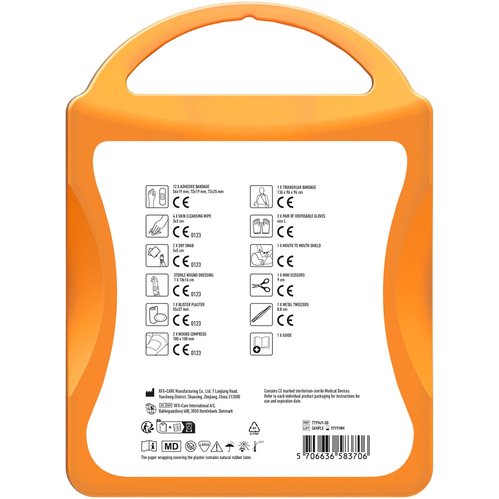 Dieses umfangreiche Erste-Hilfe Set ist ein handliches Set für Ihrem Haushalt um Verletzungen und Unfälle zu behandeln. Inhalt: 1 Erste-Hilfe-Leitfaden, 1 Blasenpflaster, 12 wasserfeste Pflaster, 1 Metall Pinzette, 1 Schere, 1 Dreieckstuch, 1 Paar Einmalhandschuhe, 2 Wundkompressen, 1 steriler Wundverband, 2 Trockentupfer, 4 hautreinigende Tupfer, 1 Mund-zu-Mund-Schutz. Alle im Set enthaltenen Erste-Hilfe- und Pflegeprodukte erfüllen alle geltenden EU-Vorschriften. Preis inkl. vollfarbigem Druck.