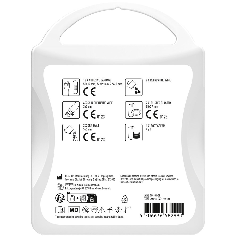 Das MyKit für den aktiven Lebensstil deckt den Bedarf an grundlegender Wundversorgung, Blasen sowie einem Fußgel zur Erholung. Ideal zum Mitnehmen bei Aktivitäten wie Wandern, Laufen, Golfen usw. Alle im Kit enthaltenen Erste-Hilfe- und Pflegeprodukte entsprechen den geltenden EU-Vorschriften. Der Preis beinhaltet Vollfarbdruck.