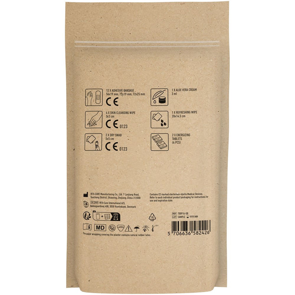 Ideales Set für neue Energie. Mit diesem Set können Sie sich erfrischen sowie neue Energie zuführen und Sie sind gut vorbereitet bei kleinen Unfällen oder Verletzungen. Inhalt: 12 wasserfeste Pflaster, 2 Täfelchen Traubenzucker (4 Stück), 1 Reinigungstuch, 1 Aloe Vera Creme, 4 hautreinigende Tupfer, 2 Trockentupfer. Alle im Set enthaltenen Erste-Hilfe- und Pflegeprodukte erfüllen alle geltenden EU-Vorschriften. Preis inkl. vollfarbigem Druck. Geliefert in Papierhülle.
