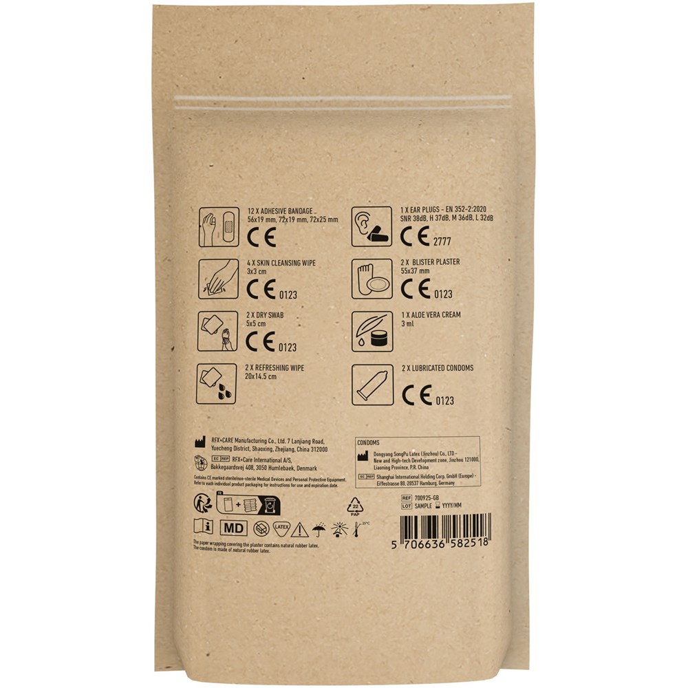 Ideales Erste-Hilfe Set für jedes Festival. Mit diesem Set sind Sie auf alles gut vorbereitet während eines Festivals. Inhalt: 12 wasserfeste Pflaster, 4 hautreinigende Tupfer, 2 Trockentupfer, 2 Reinigungstücher, 2 Kondome, 1 Blasenpflaster, 1 Aloe Vera Creme, 2 Ohrstöpsel. Alle im Set enthaltenen Erste-Hilfe- und Pflegeprodukte erfüllen alle geltenden EU-Vorschriften. Preis inkl. vollfarbigem Druck. Geliefert in Papierhülle.