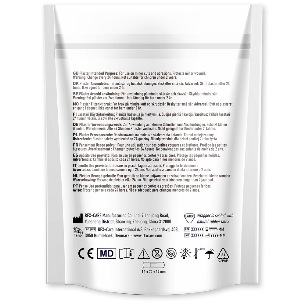 10 Stück individuell gestaltbare Pflaster mit bedruckter Papiertasche Vollfarbiger Digitaldruck auf der Verpackung möglich. Dieses Produkt erfüllt die strengen Anforderungen der Medizinprodukteverordnung (MDR) und ist bei der FDA in mehreren Ländern registriert. Entspricht den Normen ISO14001:2015 und ISO9001:2015. Pflastergröße: 72x19 mm.