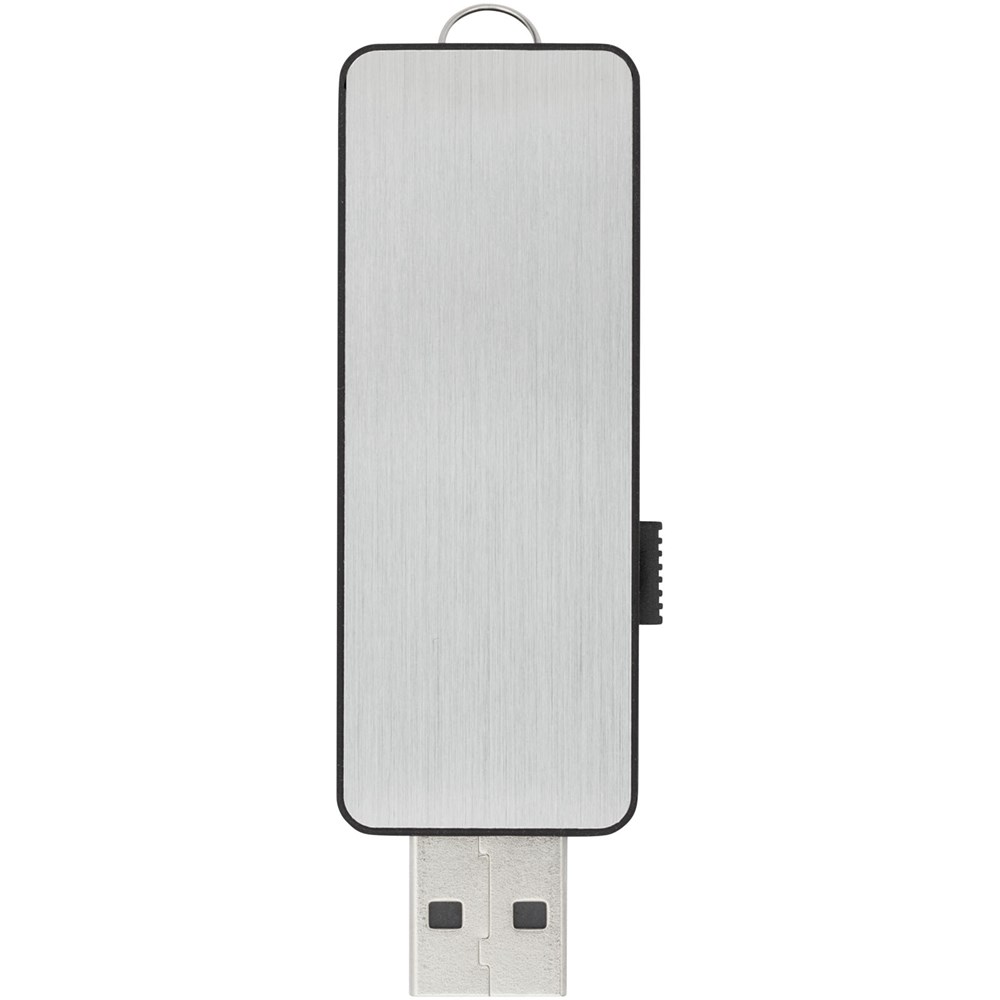 USB-Stick mit auffälligem Leuchteffekt des Logos (weißes Licht), der beim Anschluss an einen Computer ein eingraviertes Logo aufleuchten lässt.