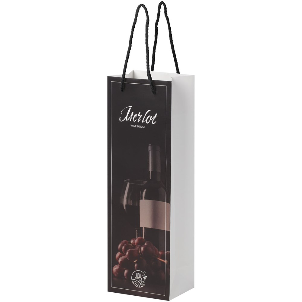 Handgefertigte Weinflaschentüte aus mattem 170 g/m2 Integra-Papier (12 × 9 × 37 cm) mit Kordelgriffen. Die personalisierbare Vorder- und Rückseite bietet viel Platz für ein Logo oder ein anderes Design und ist somit ein hervorragendes Marketinginstrument für Unternehmen. Hergestellt in Europa und 100% recycelbar.