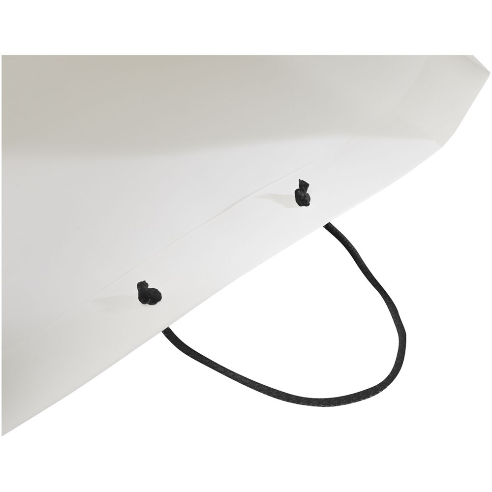 XXL handgefertigte matte 170 g/m2 Integra-Papiertüte (45 × 10 × 35 cm) mit Kordelgriffen. Die personalisierbare Vorder- und Rückseite bietet viel Platz für ein Logo oder ein anderes Design und ist somit ein hervorragendes Marketinginstrument für Unternehmen. Hergestellt in Europa und 100% recycelbar.
