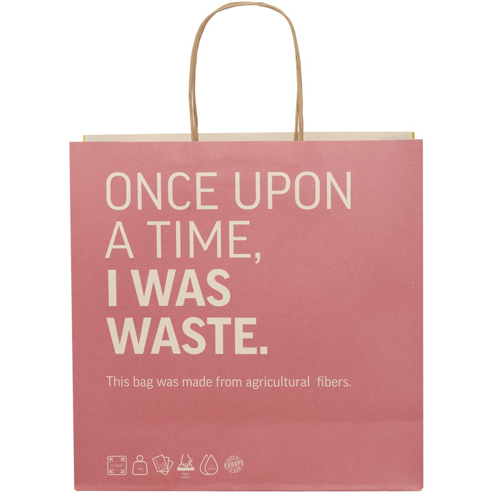 Extra große 150 g/m2 Papiertüte (31 × 12 × 31 cm) aus landwirtschaftlichen Reststoffen mit gedrehten Papiergriffen. Die personalisierbare Vorder- und Rückseite bietet viel Platz für ein Logo oder ein anderes Design und ist somit ein hervorragendes Marketinginstrument für Unternehmen. Hergestellt in Europa und zu 100 % recycelbar. Diese Tragetasche ist eine nachhaltige Wahl für umweltbewusste Unternehmen und Personen, die eine nachhaltige Verpackungslösung suchen.
