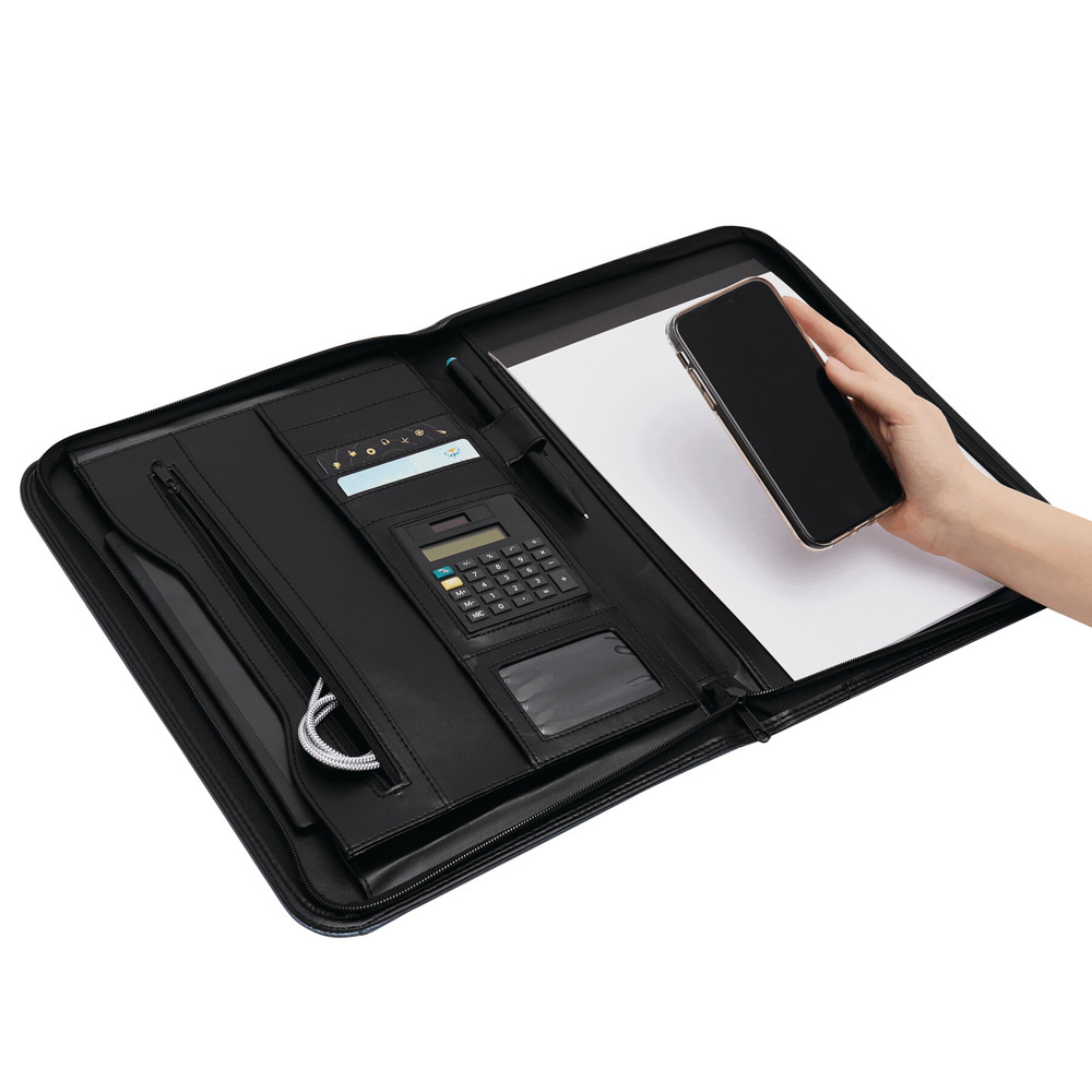 Portfolio GENTLE im DIN-A4-Format: umlaufender Reißverschluss zum Verschließen, innen diverse Einsteckfächer, 1 Klarsichtfach, 1 Reißverschluss-Innenfach, inkl. Schreibblock (blanko), Schlaufe für 1 Schreibgerät, Taschenrechner, außen 1 Einsteckfach