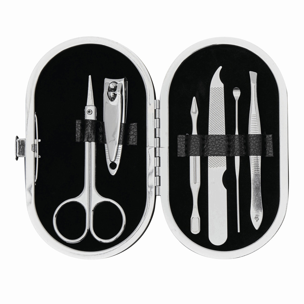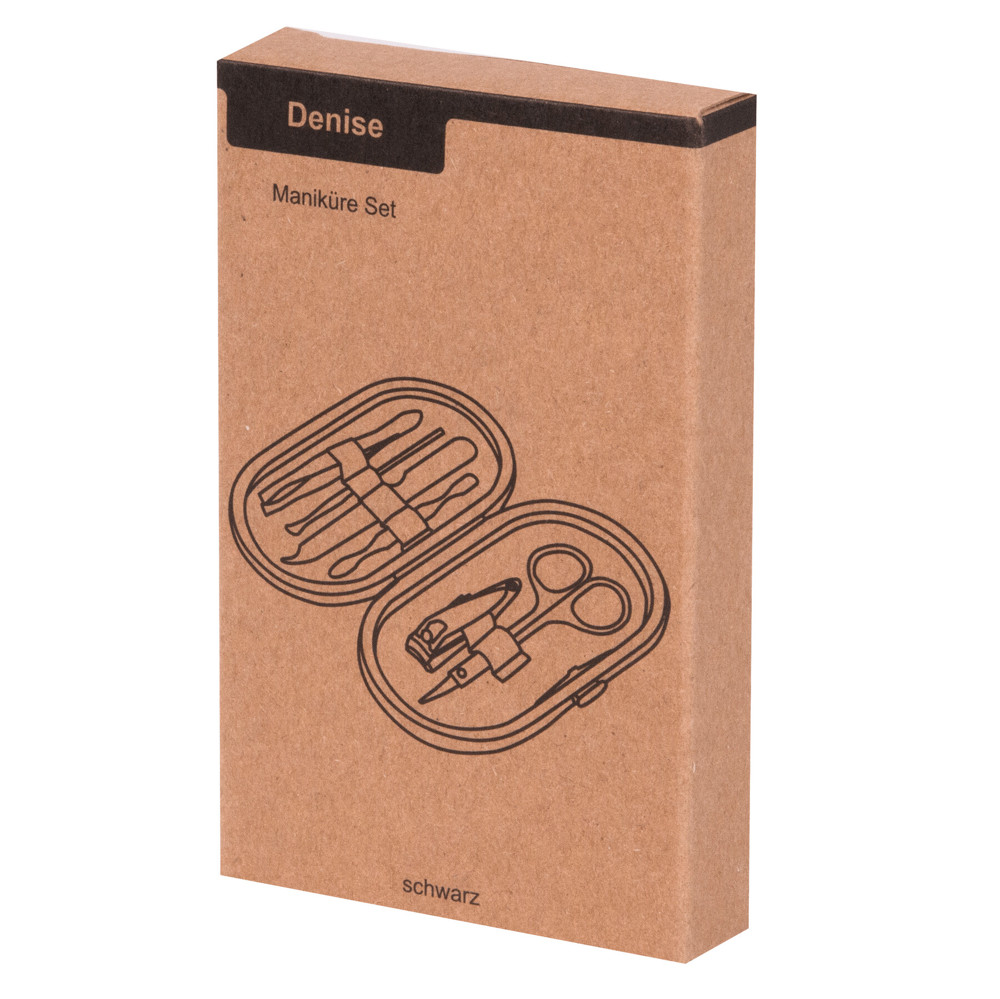 Maniküreset DENISE, 6-teilig: bestehend aus Nagelschere, Nagelfeile, Pinzette, Nagelknipser, Nagelstab und Nagelschaber, im ovalen Etui mit Seitknopfverschluss