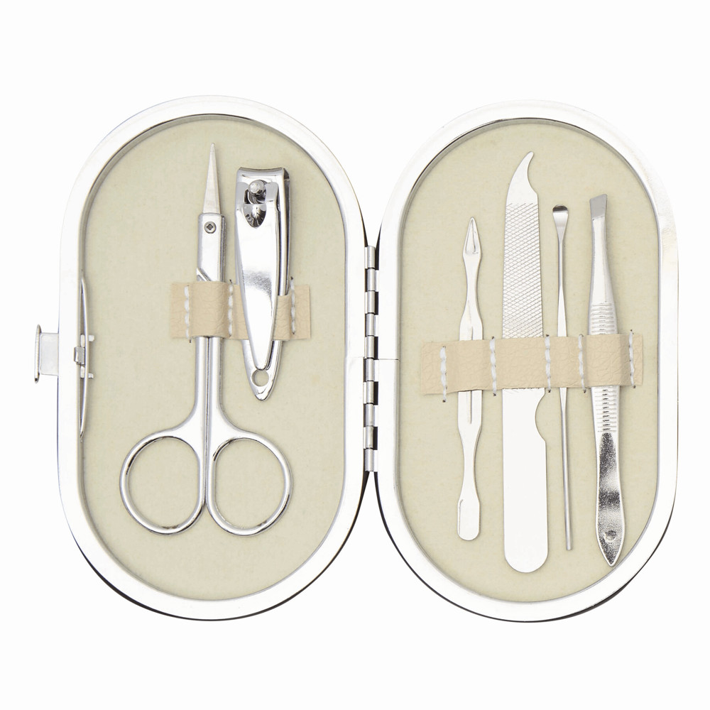 Maniküreset DENISE, 6-teilig: bestehend aus Nagelschere, Nagelfeile, Pinzette, Nagelknipser, Nagelstab und Nagelschaber, im ovalen Etui mit Seitknopfverschluss