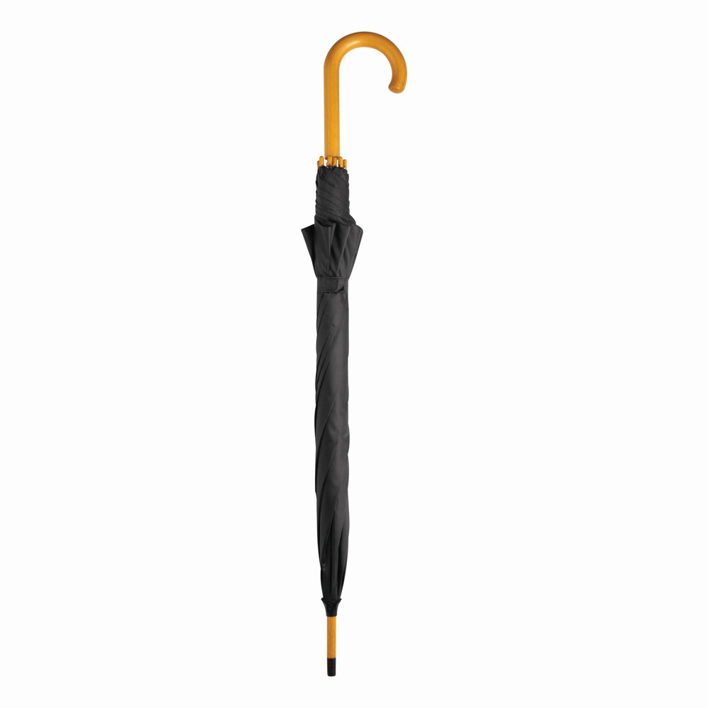 Automatik-Holzstockschirm TANGO: Metallspeichen, Holztips und -Rundhakengriff, Polyester-Bespannung, Schließband mit Klettverschluss