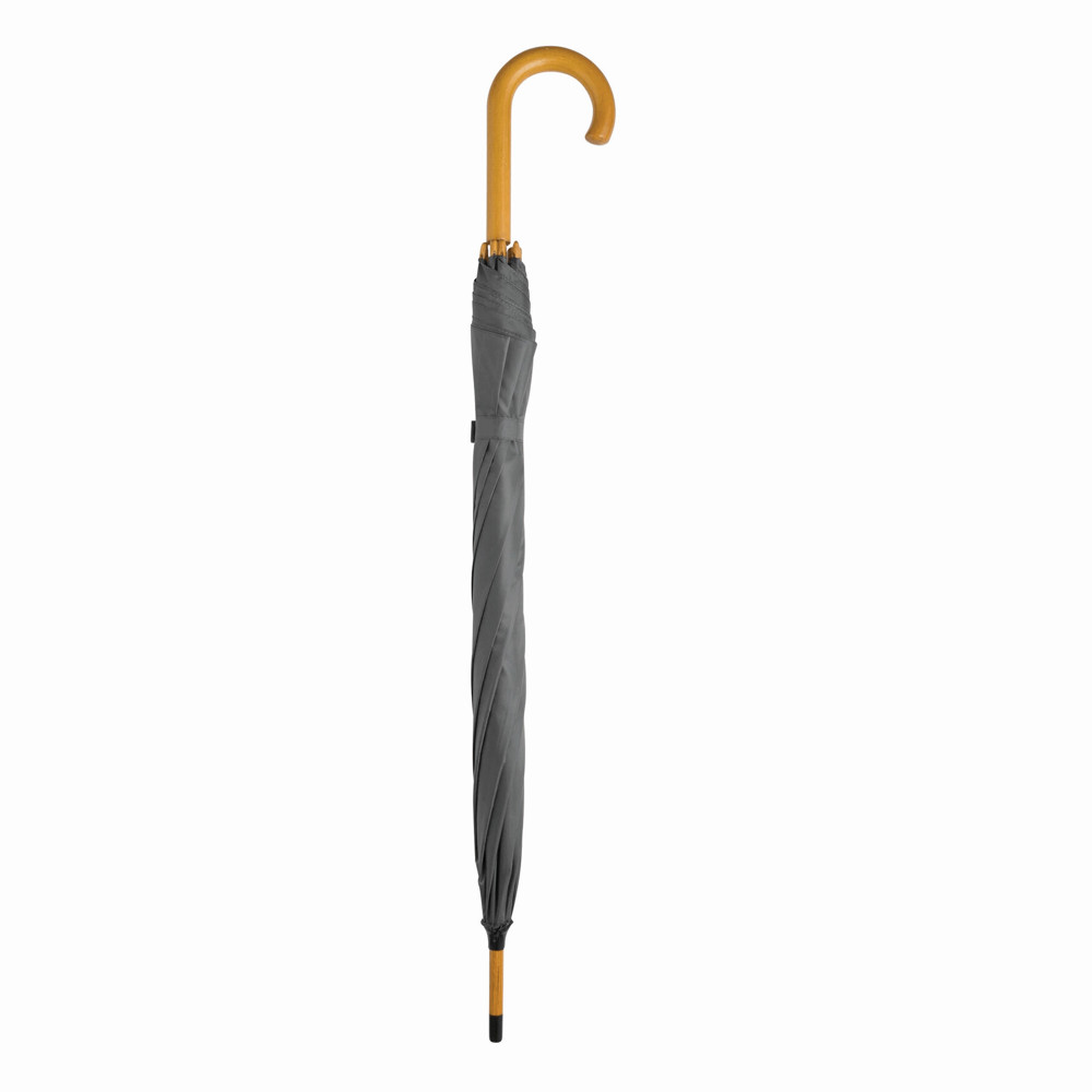 Automatik-Holzstockschirm TANGO: Metallspeichen, Holztips und -Rundhakengriff, Polyester-Bespannung, Schließband mit Klettverschluss
