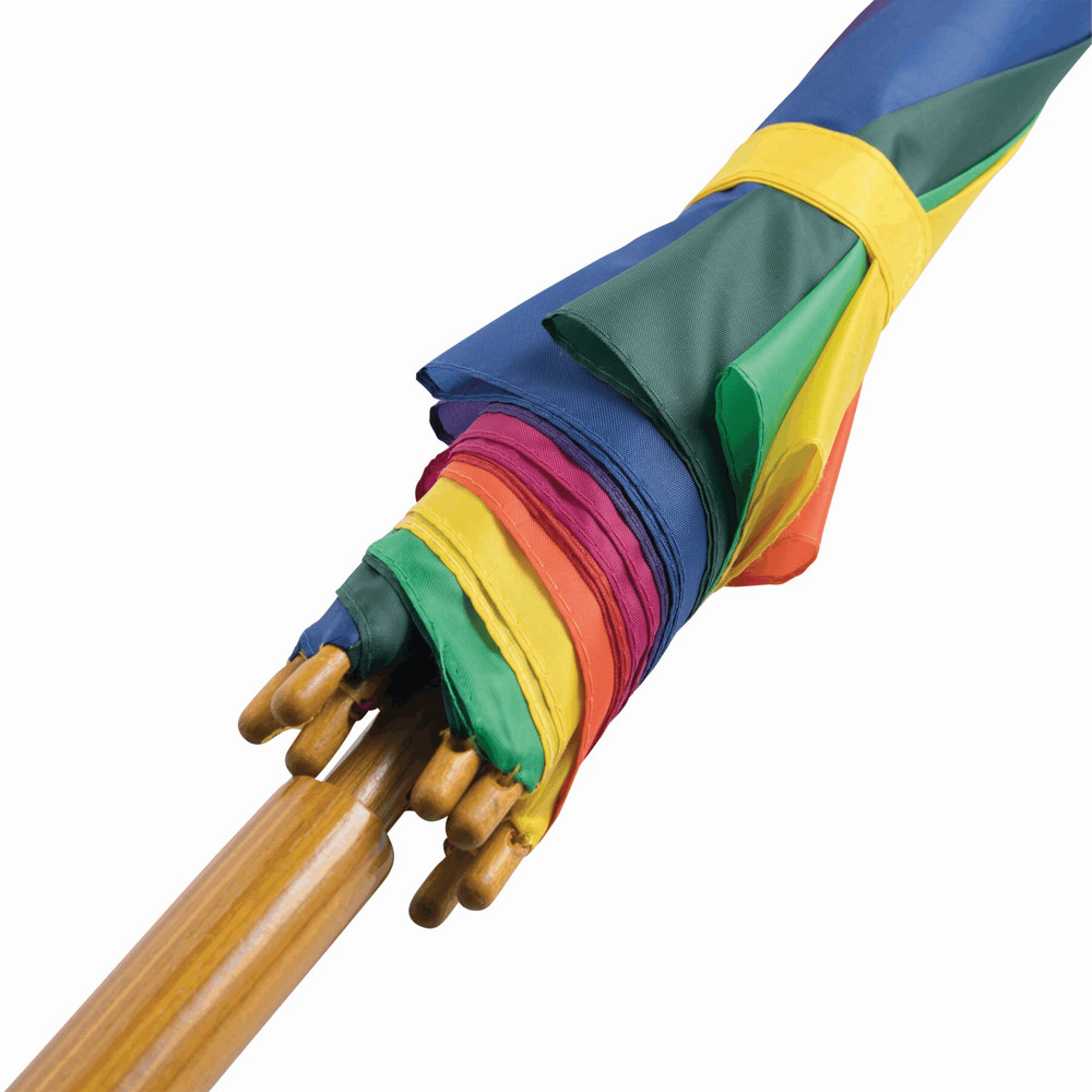Automatik-Holzstockschirm TANGO: Metallspeichen, Holztips und -Rundhakengriff, Polyester-Bespannung, Schließband mit Klettverschluss