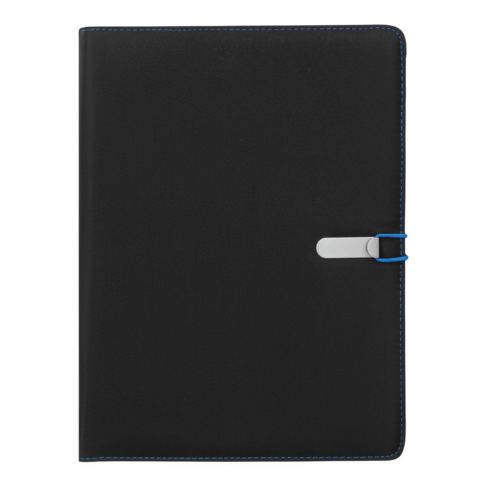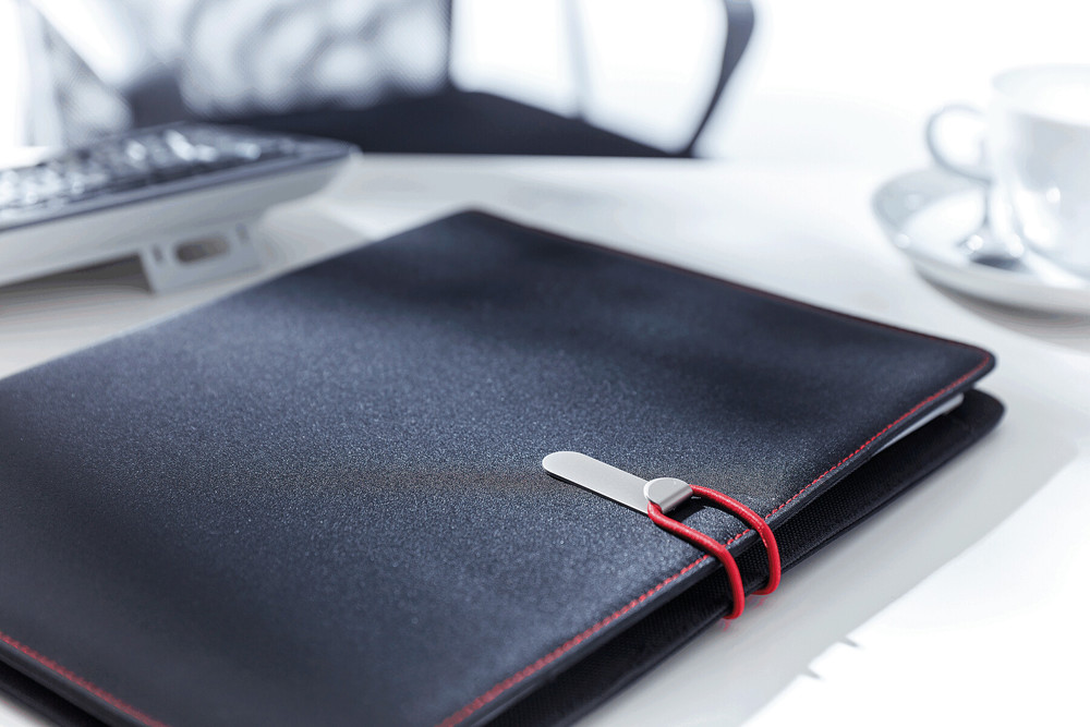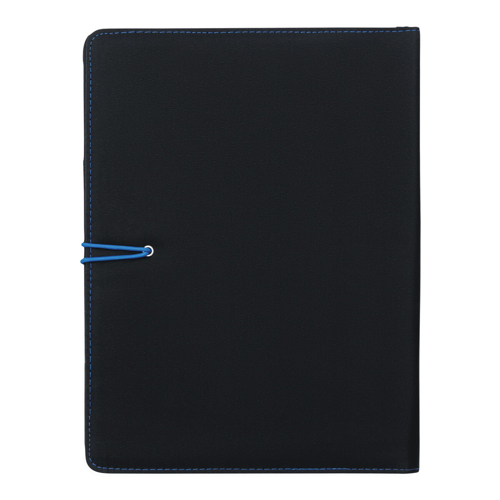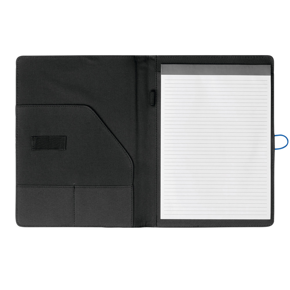 Konferenzmappe SESSION im DIN-A4-Format: Metallhaken mit farbigem Gummiband zum Verschließen, innen diverse Einsteckfächer, 2 elastische Schlaufen, inkl. Schreibblock (liniert), Schlaufe für 1 Schreibgerät, außen mit farbigen Ziernähten