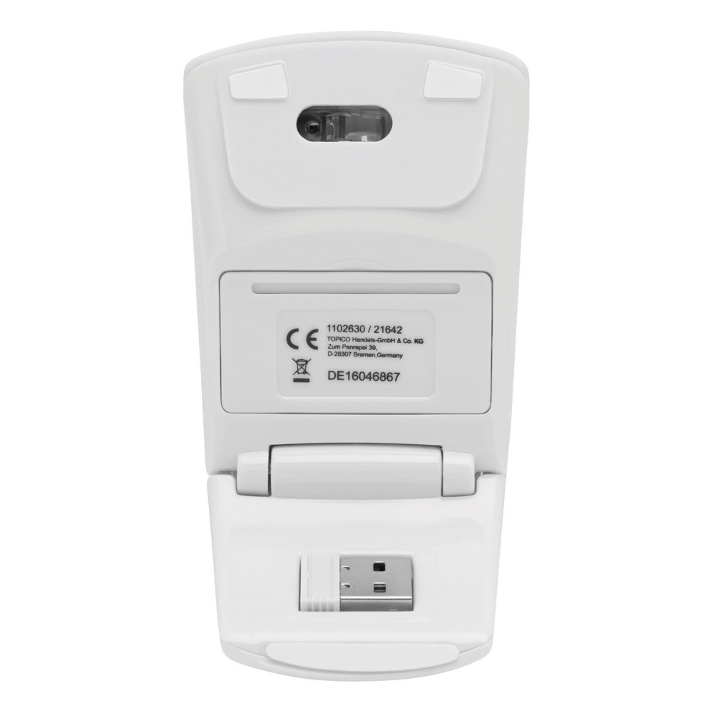 Optische Klappmaus SINUO, kabellos: Maus mit 3 Tasten und einem Scrollrad, USB-Dongle wird mit Magnet an Unterseite des Gerätes fixiert, Auflösung 800 / 1.600 dpi, Arbeitsdistanz bis 10 m, Plug + Play (keine Software notwendig), batteriebetrieben (2x AAA Batterie nicht enthalten), in Box
