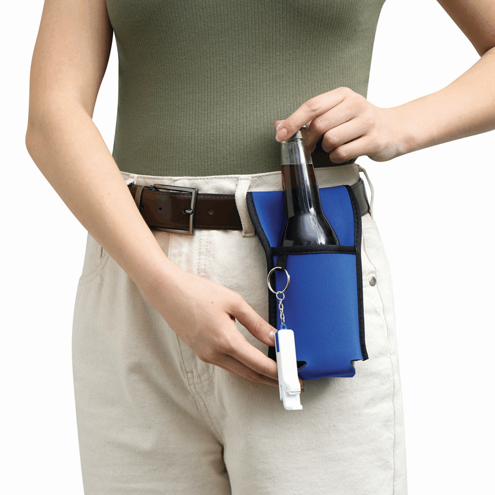 Flaschenhalter COOL HIKING in Neopren-Optik: geeignet für Flaschen und Dosen mit einem Durchmesser von ca. 7 cm – mit Klettverschluss zum Befestigen an Gürtel, Fahrradlenker und Kinderwagen, extra Schlaufe für einen Flaschenöffner (exklusive) oder Schlüssel, Manschette mit exponierter Werbefläche