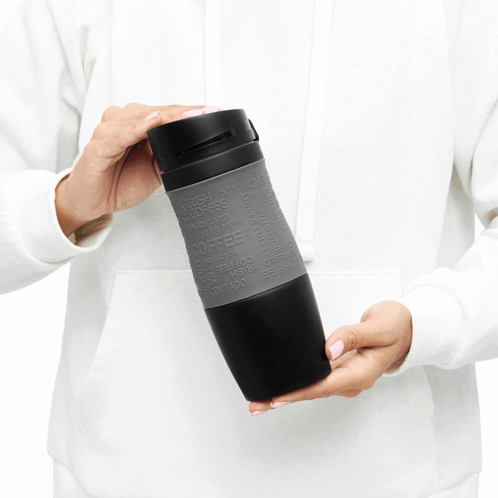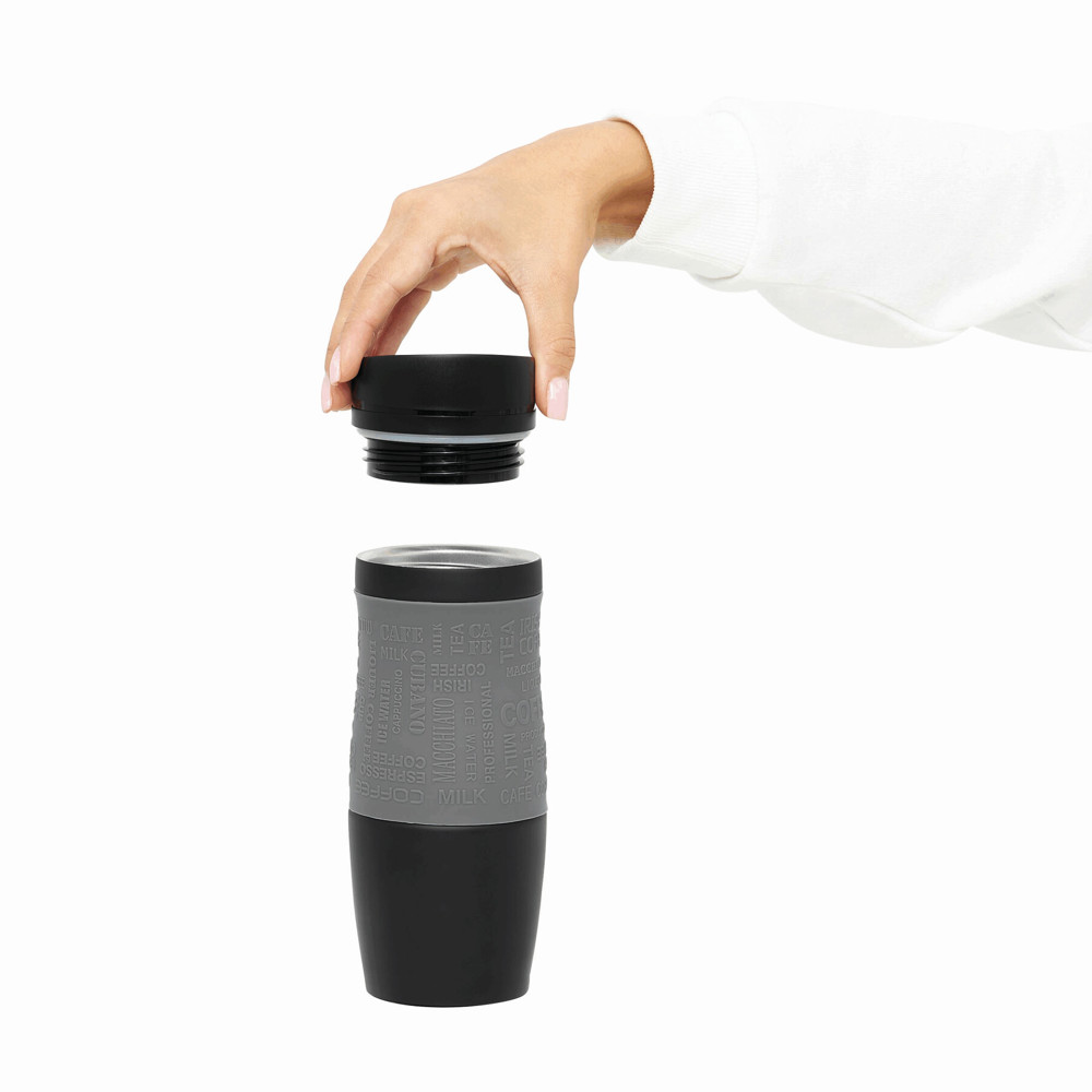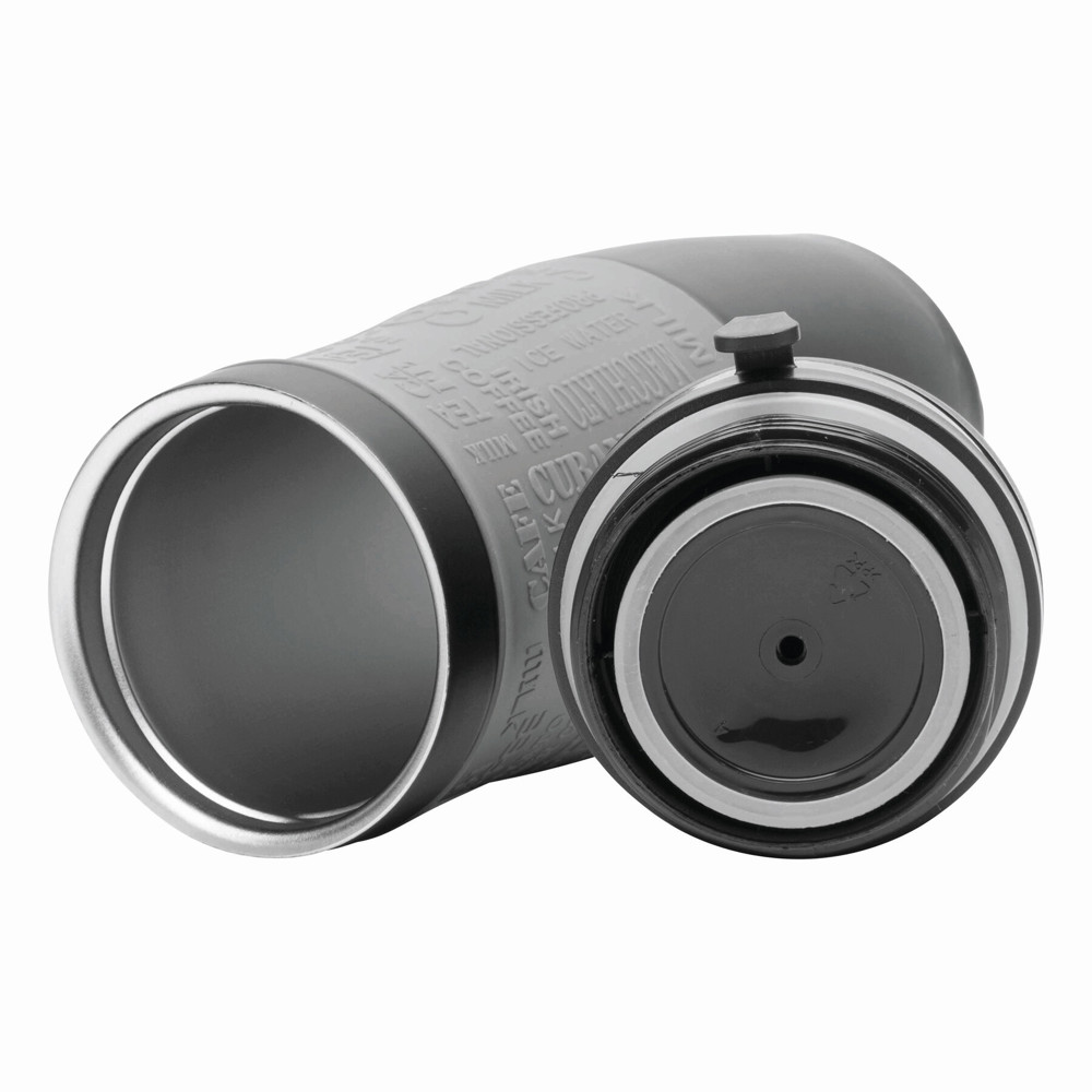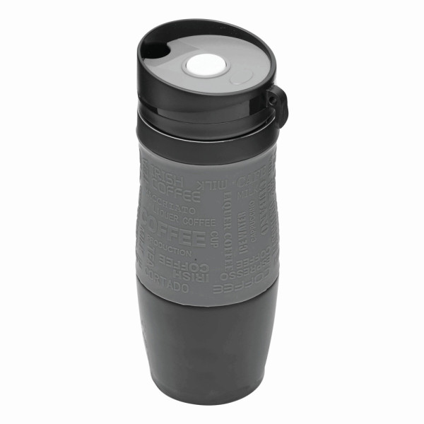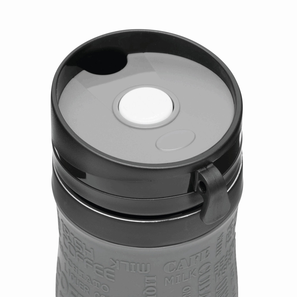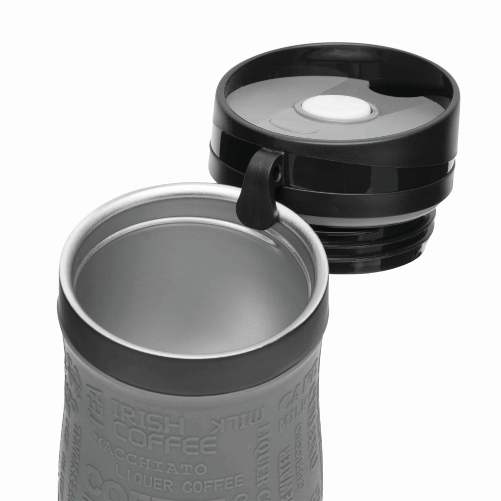 Isolierbecher GOLDEN DREAM, doppelwandig: innen und außen aus Edelstahl, Kunststoff-Deckel mit sicherem Schraubverschluss, Push-Button OPEN/CLOSE und integrierter Trinköffnung – außen Haken, mit dem sich der Deckel an den Becher hängen lässt, farbig-gummierte Silikon-Manschette für optimale Griffigkeit, Füllmenge ca. 380 ml, in Box
