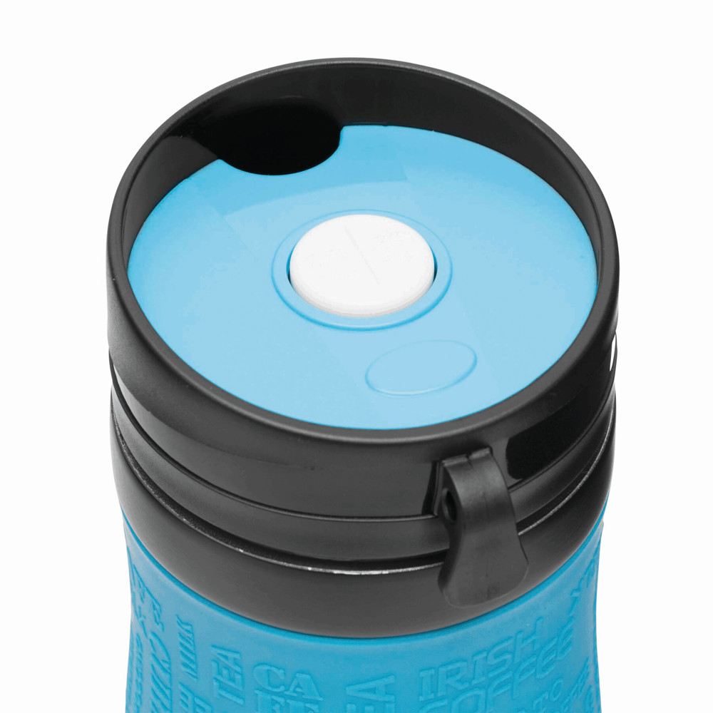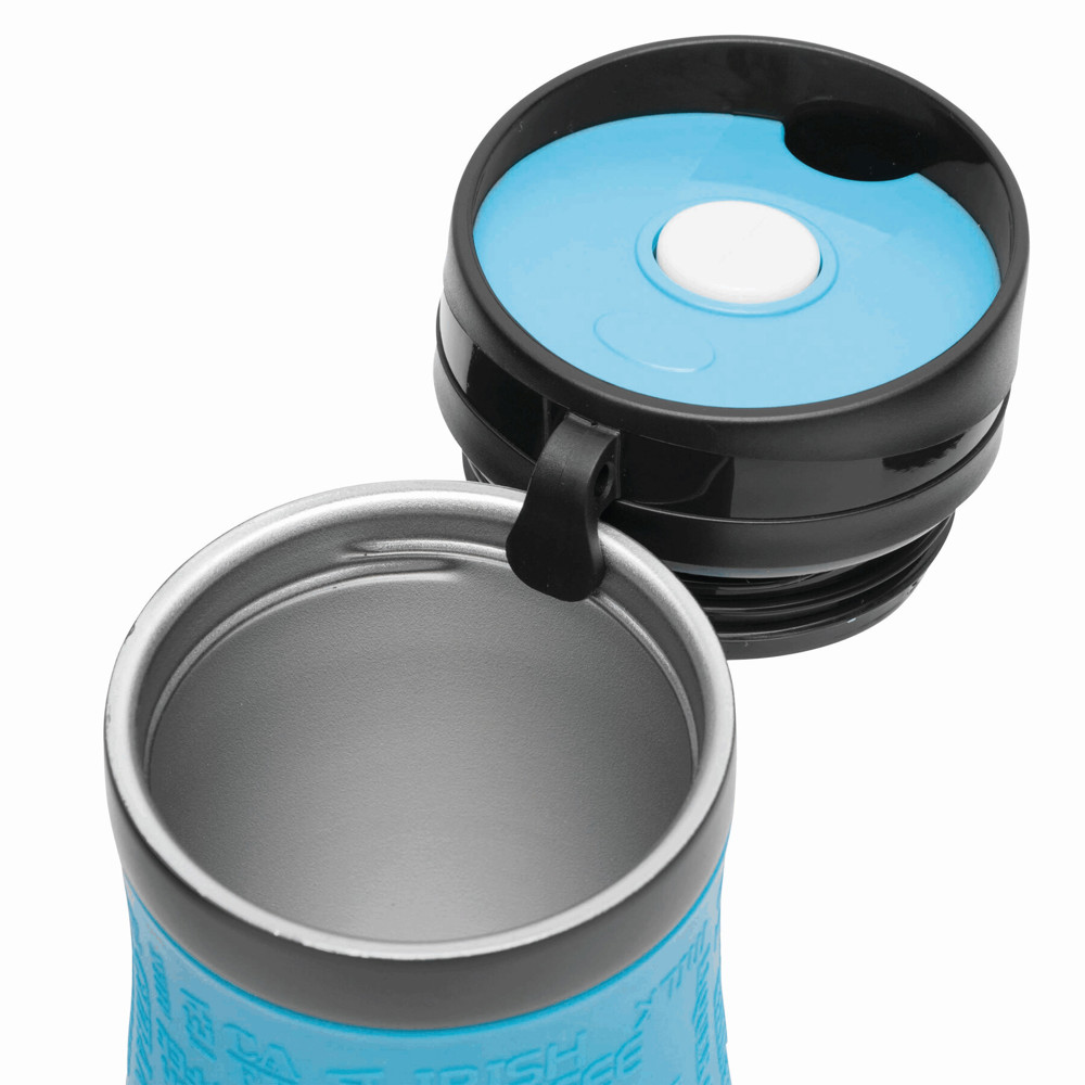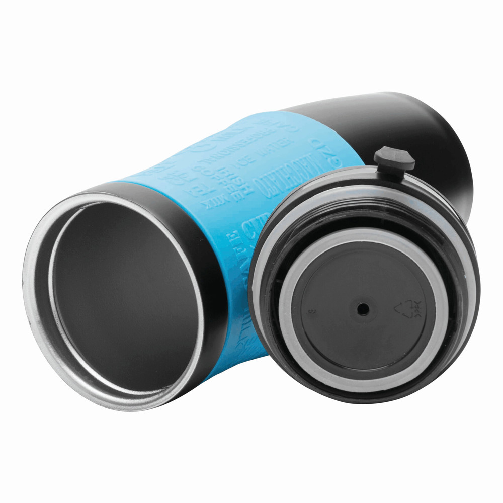 Isolierbecher GOLDEN DREAM, doppelwandig: innen und außen aus Edelstahl, Kunststoff-Deckel mit sicherem Schraubverschluss, Push-Button OPEN/CLOSE und integrierter Trinköffnung – außen Haken, mit dem sich der Deckel an den Becher hängen lässt, farbig-gummierte Silikon-Manschette für optimale Griffigkeit, Füllmenge ca. 380 ml, in Box