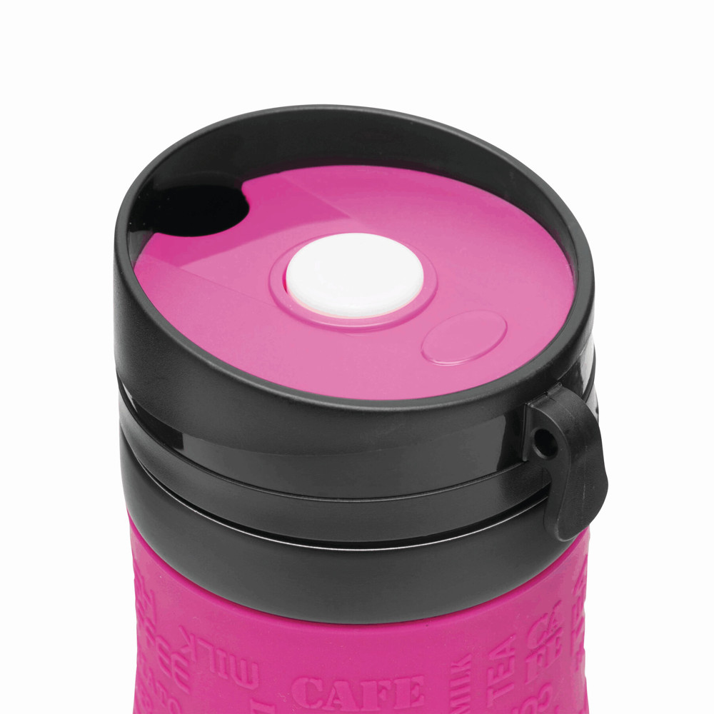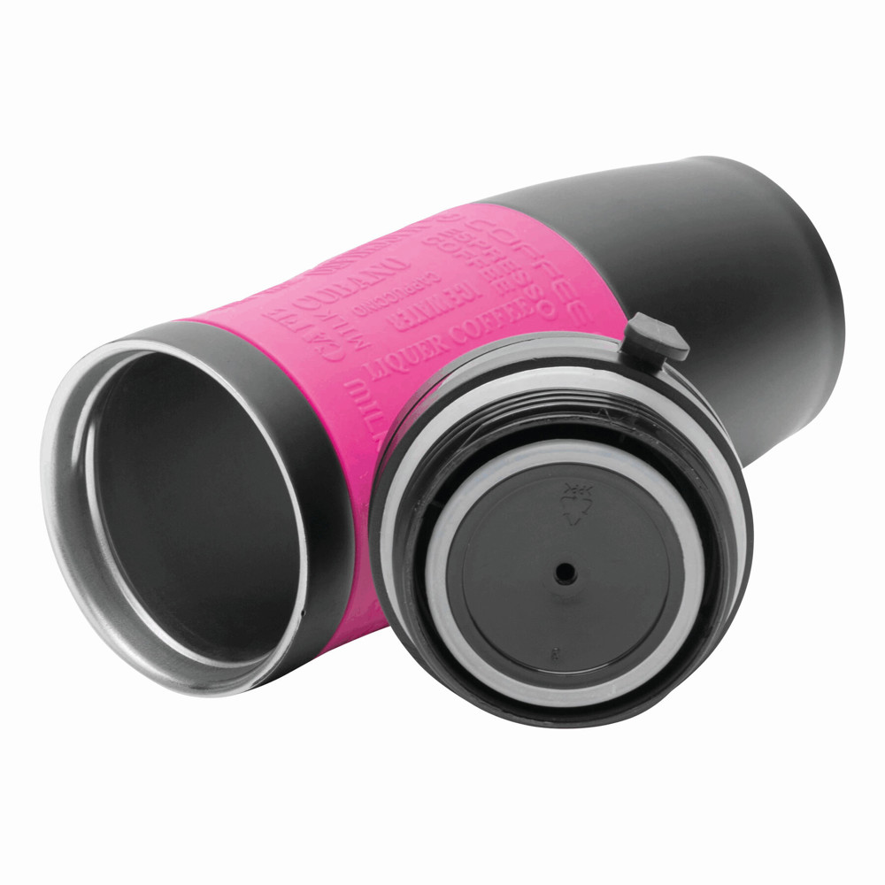 Isolierbecher GOLDEN DREAM, doppelwandig: innen und außen aus Edelstahl, Kunststoff-Deckel mit sicherem Schraubverschluss, Push-Button OPEN/CLOSE und integrierter Trinköffnung – außen Haken, mit dem sich der Deckel an den Becher hängen lässt, farbig-gummierte Silikon-Manschette für optimale Griffigkeit, Füllmenge ca. 380 ml, in Box