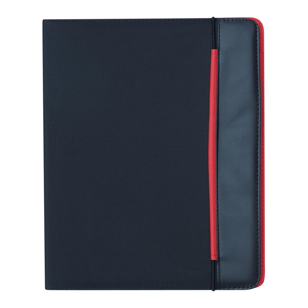 Konferenzmappe YOUNG STAR im DIN-A4-Format: Gummiband zum Verschließen, innen diverse Einsteckfächer, inkl. Schreibblock (liniert), Schlaufe für 1 Schreibgerät, innen farbig abgesetzt - außen schwarz mit farbigem Zierstreifen