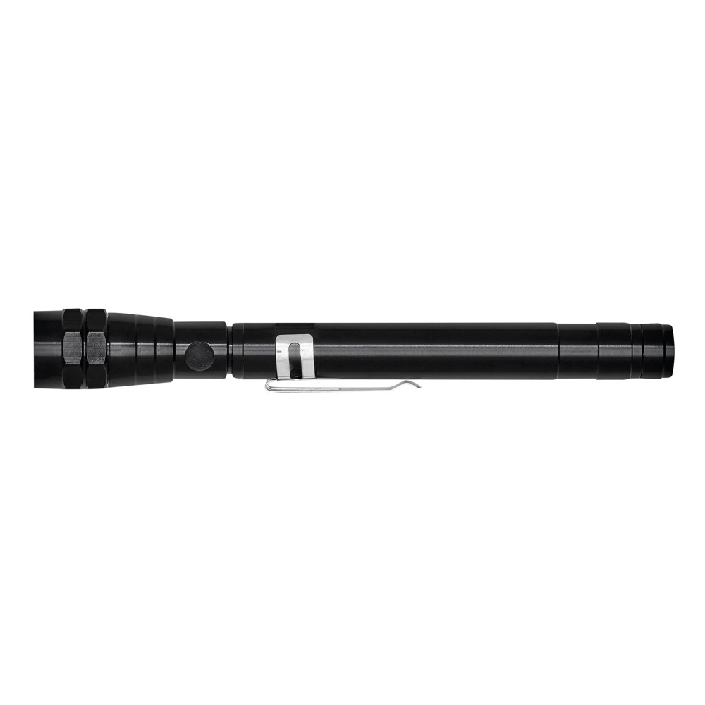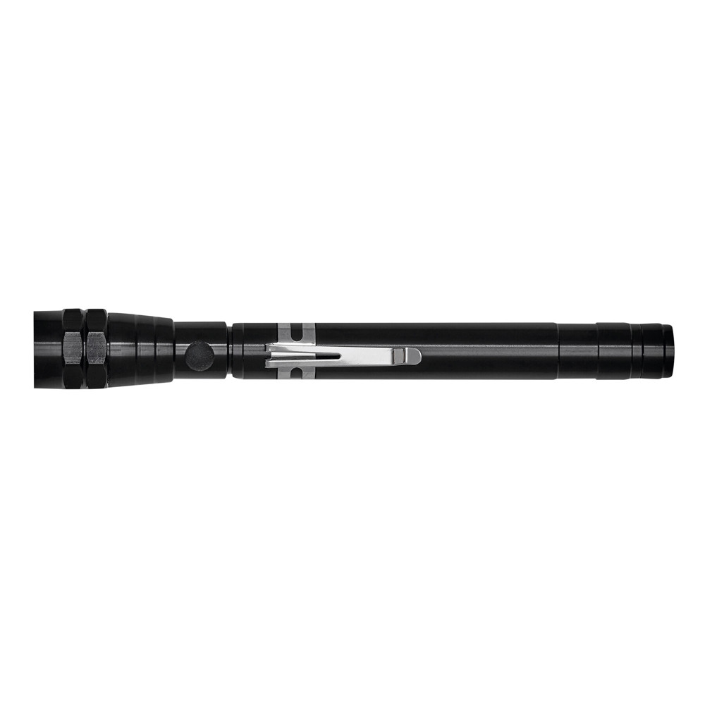 LED-Taschenlampe REFLECT: 3 lichtstarke weiße LED, gummierter An- und Ausschalter, mit bis auf ca. 55 cm ausziehbares Teleskopsystem, schwenkbarer Lampenkopf, Magnetring, praktischer Befestigungsclip, Gehäuse aus Aluminium, batteriebetrieben (4x LR44 Knopfzellen enthalten), in Box
