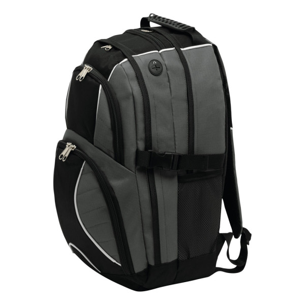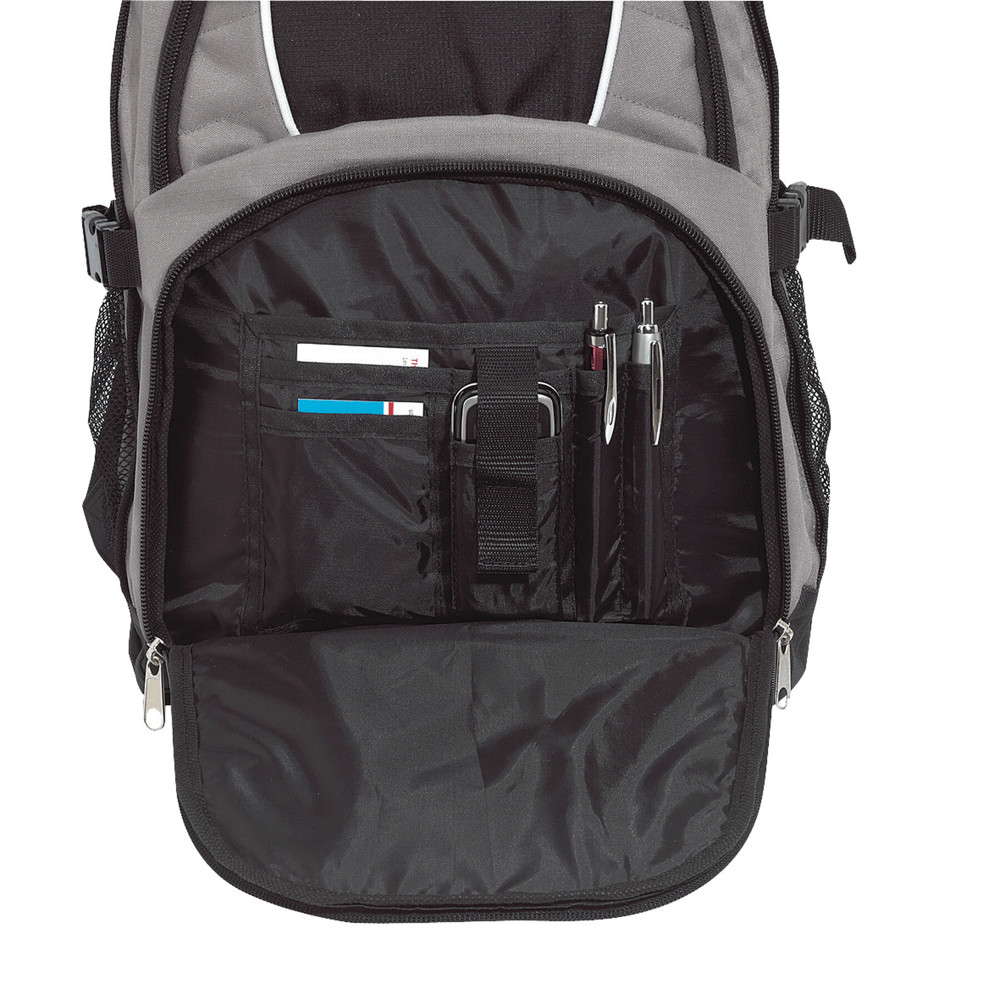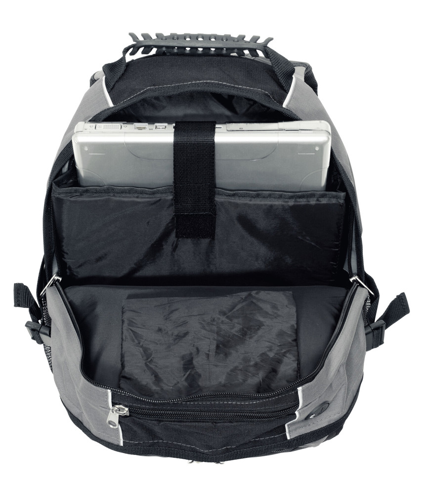 Rucksack HYPE: 2 Reißverschluss-Vorfächer – eins davon mit kleinem Organizerfach, 2 Reißverschluss-Hauptfächer; eines mit gepolstertem Notebookfach, das andere Reißverschluss-Hauptfach mit Kabelausgang und extra gepolstertem Fach für z.B. Smartphone oder andere Geräte, 1 Reißverschluss-Schlüsselfach, 2 seitliche Netzeinsteckfächer und Kompressionsgurte, verstärkter Tragegriff, gepolsterte Schultergurte und Rückenbereich