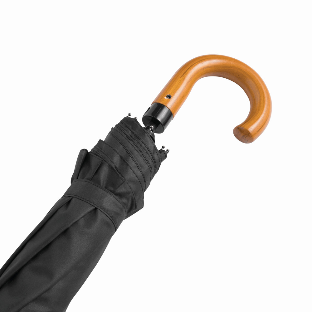 Automatik-Herrentaschenschirm LORD: 3-teiliger Metallstock, Metall- / Fiberglasspeichen, Holz-Rundhakengriff, Polyester-Pongee-Bespannung und -Hülle, mit stark wasserabweisender Spezialbeschichtung, Schließband mit Klettverschluss