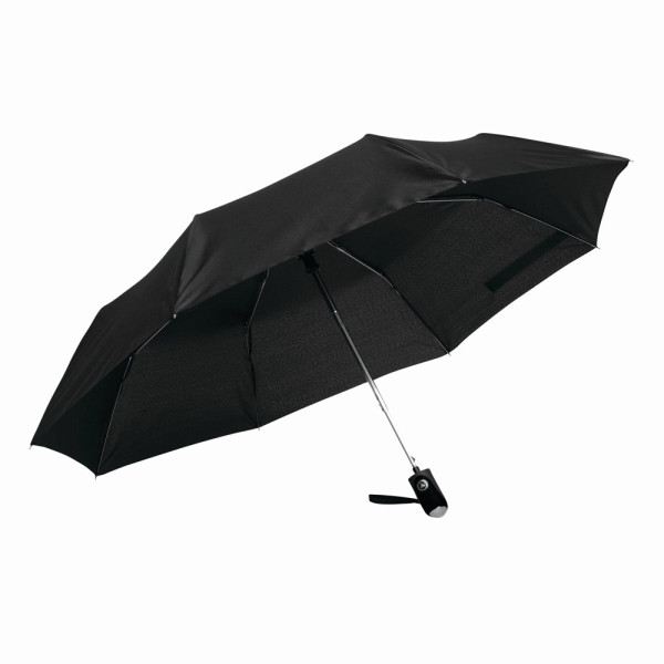 Automatik-Taschenschirm COVER: 3-teiliger Metallstock, Metallspeichen und -tips, gummierter Griff, Polyester-Pongee-Bespannung und -Hülle, Schließband mit Klettverschluss