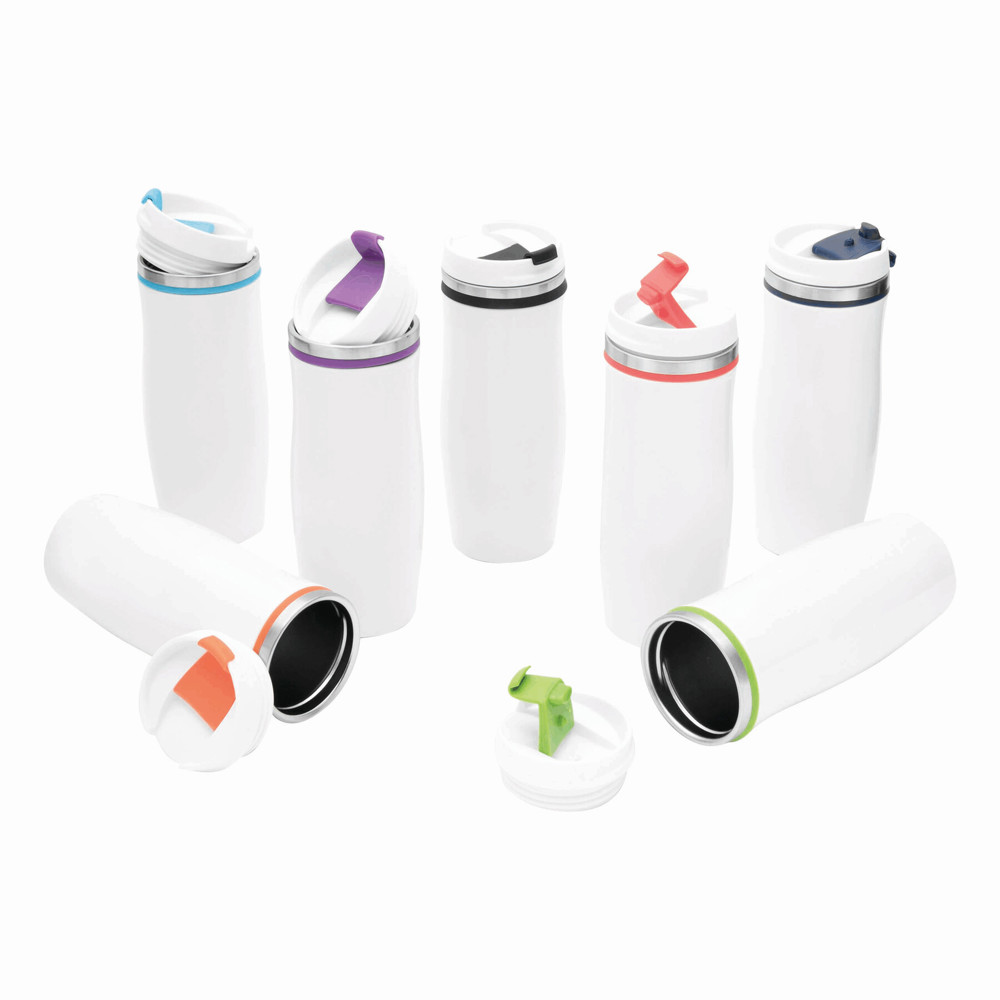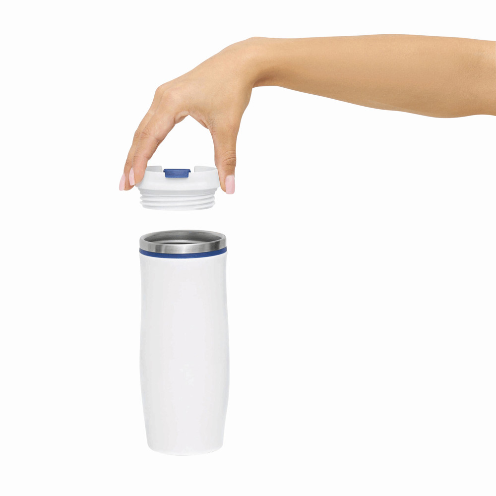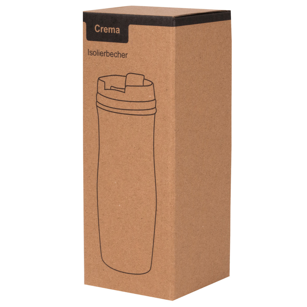 Isolierbecher CREMA, doppelwandig: innen und außen aus Edelstahl, Kunststoff-Deckel mit sicherem Schraubverschluss und integrierter Trinköffnung zum Aufklappen, farbig-gummierte Manschette oben sowie gummierter Standfuß für gute Bodenhaftung, Füllmenge ca. 400 ml, in Box