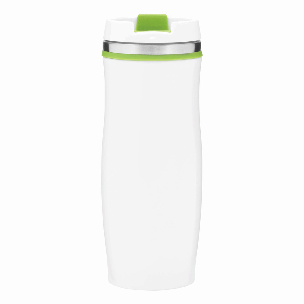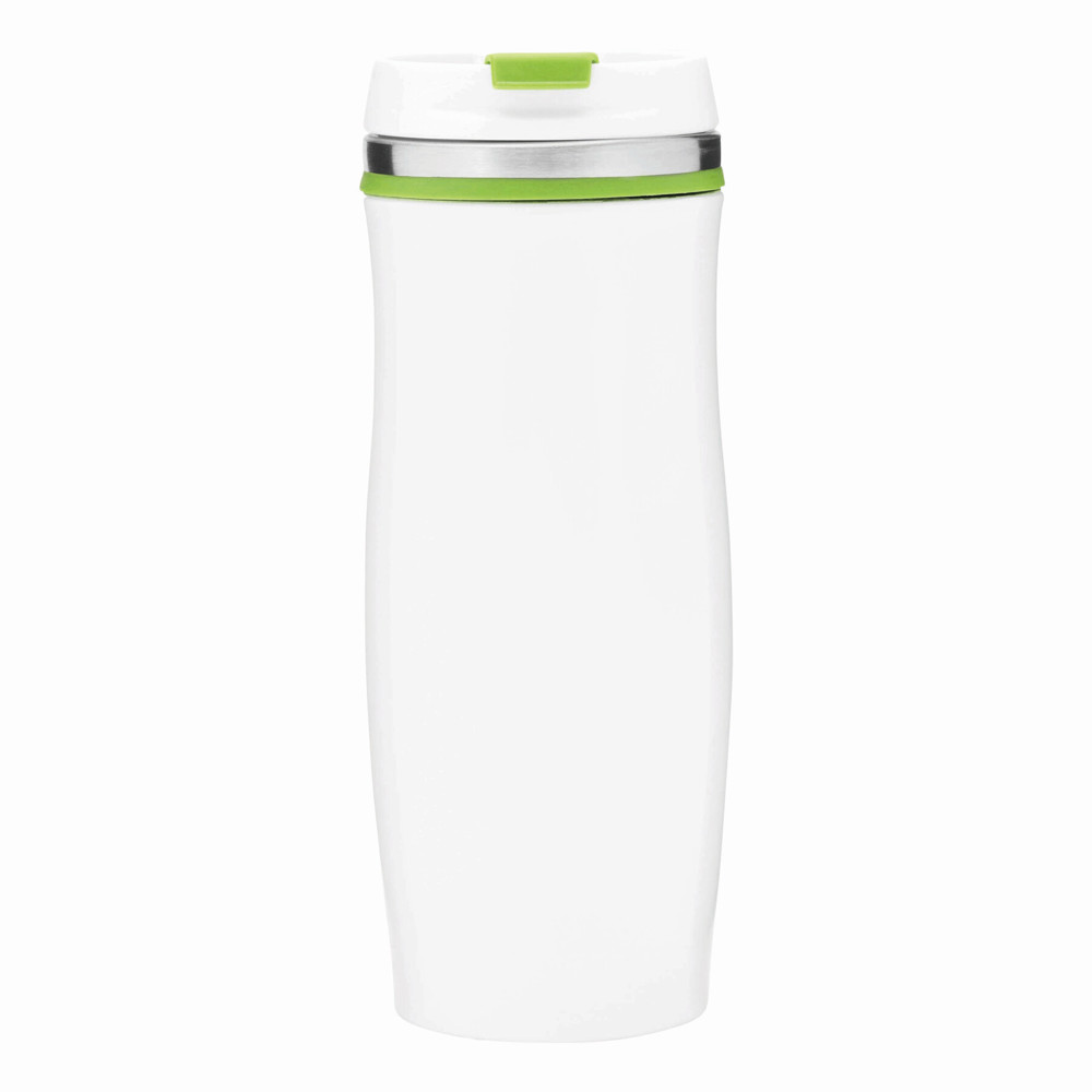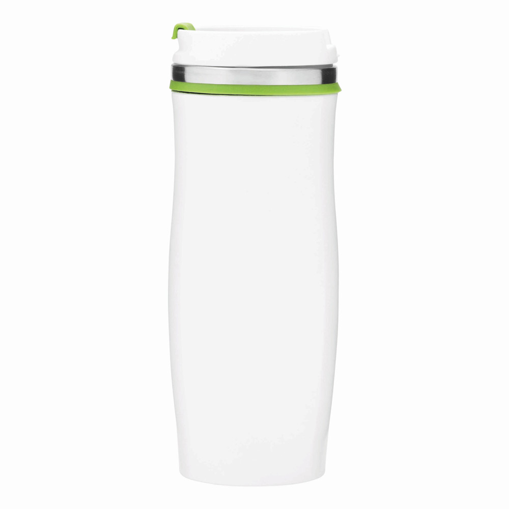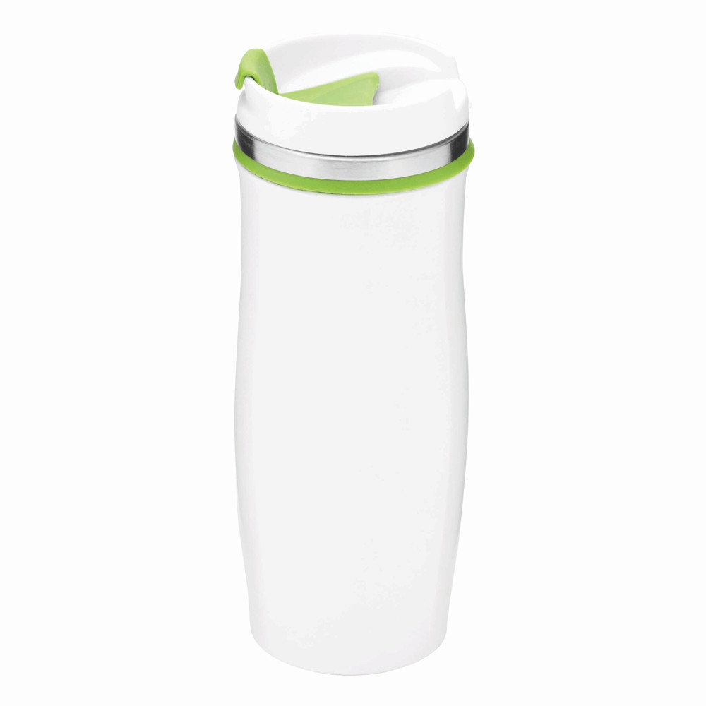 Isolierbecher CREMA, doppelwandig: innen und außen aus Edelstahl, Kunststoff-Deckel mit sicherem Schraubverschluss und integrierter Trinköffnung zum Aufklappen, farbig-gummierte Manschette oben sowie gummierter Standfuß für gute Bodenhaftung, Füllmenge ca. 400 ml, in Box