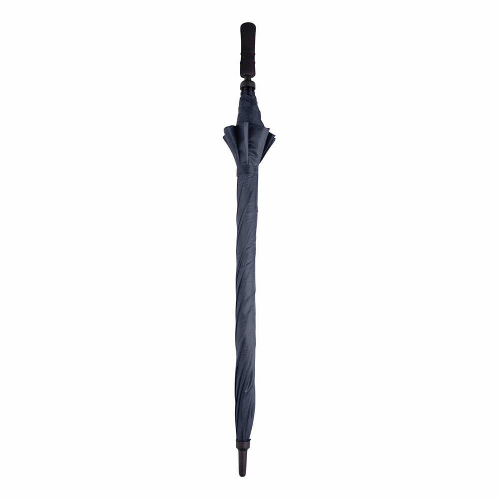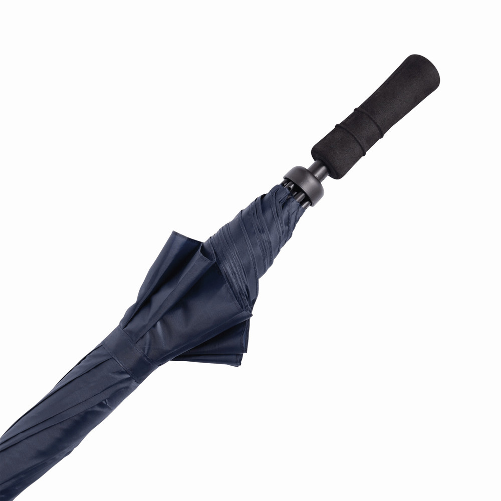 Sturmschirm TORNADO: Fiberglasstock, Doppelmetallspeichen und Rückholautomatik-Feder, Kunststofftips, Moosgummigriff, Polyester-Bespannung, Schließband mit Klettverschluss