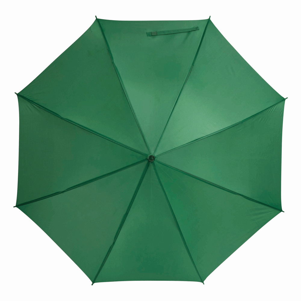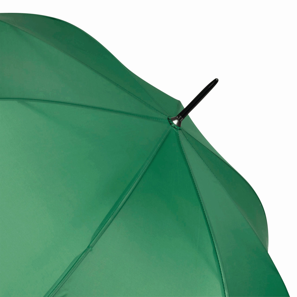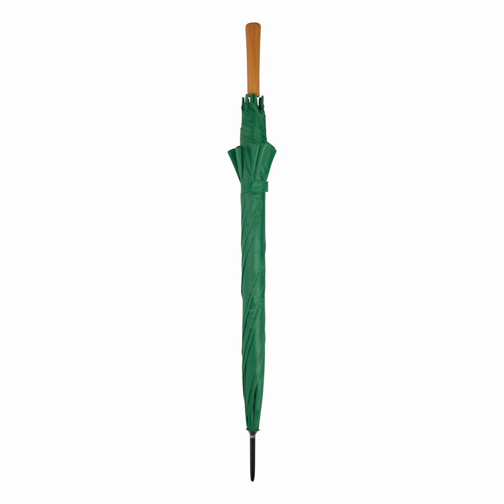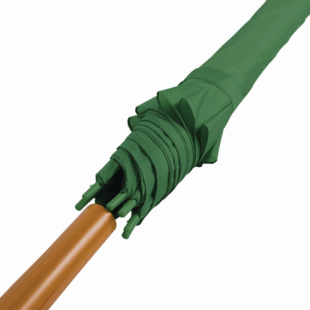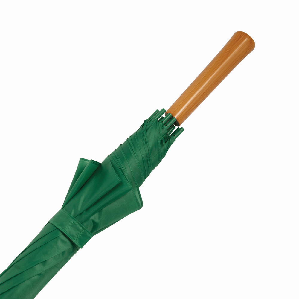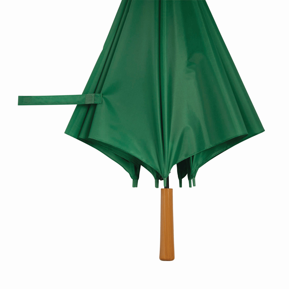 Automatik-Stockschirm LIMBO: Metallstock und -speichen, farblich abgestimmte Kunststofftips, Griff in Holz-Optik, Polyester-Bespannung, Schließband mit Klettverschluss