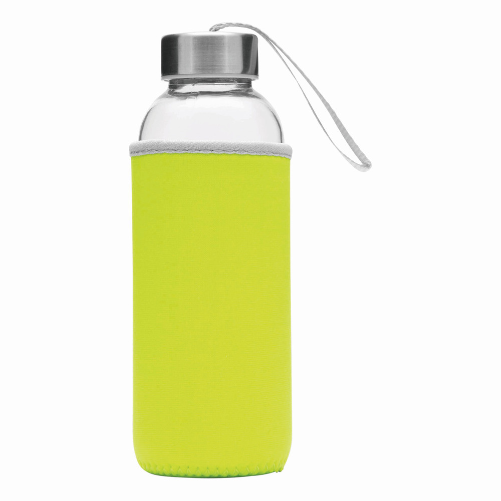 Glas-Trinkflasche TAKE WELL: Edelstahldeckel mit Schraubverschluss, Silikon-Dichtring und Handschlaufe, inkl. farbiger Schutzhülle, Füllmenge ca. 450 ml, in Box