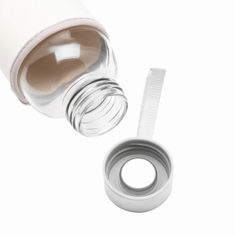 Glas-Trinkflasche TAKE WELL: Edelstahldeckel mit Schraubverschluss, Silikon-Dichtring und Handschlaufe, inkl. farbiger Schutzhülle, Füllmenge ca. 450 ml, in Box