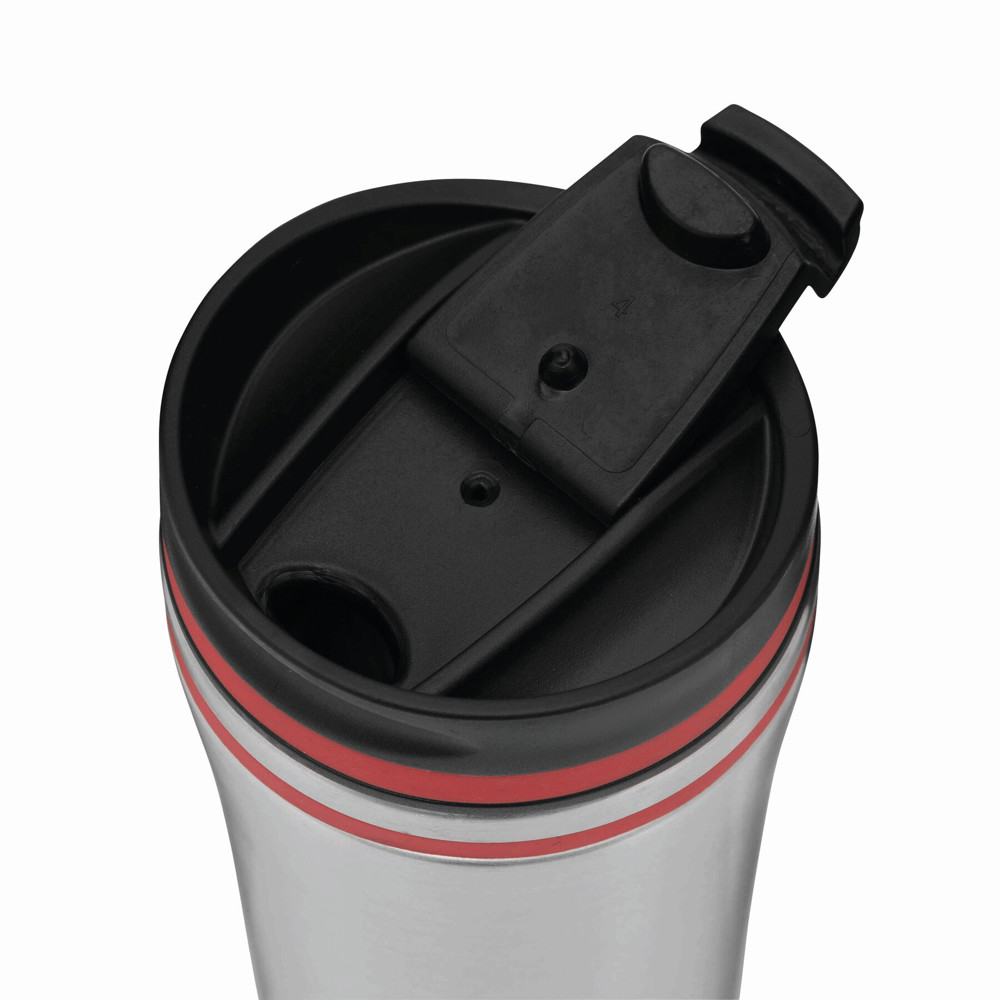 Isolierbecher LIBERICA, doppelwandig: innen und außen aus Edelstahl, Deckel mit sicherem Schraubverschluss und integrierter Trinköffnung zum Aufklappen, farbige Applikation, Füllmenge ca. 400 ml