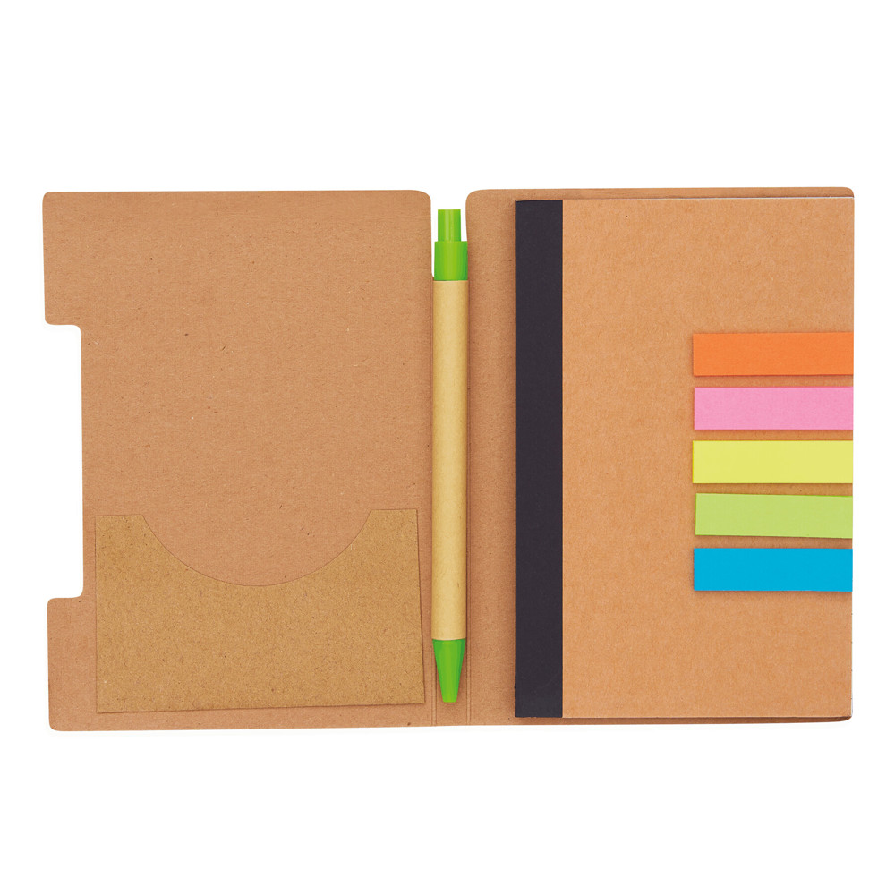 Notizbuch PENZ: 70 Blätter, liniert, 70 g/m², inkl. Kugelschreiber (schwarzschreibend) aus Kunststoff/Pappe, mit 5 verschiedenfarbigen Klebenotizstreifen, Einschubfach für Visitenkarten sowie Gummiband zum Verschließen