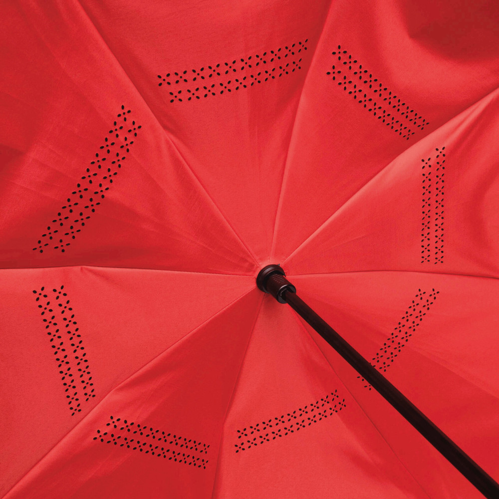 Stockschirm FLIPPED: mit umgekehrtem Öffnungs- und Schließmechanismus, Sicherheitsschieber, freie Hände dank C-Shape-Griff, Doppel-Bezug mit Ventilationsmuster zur Vermeidung von Luftstau, flexibles Gestänge durch Fiberglasspeichen, Metallstock, mit Metalltips, Polyester-Pongee-Bespannung, Schließband mit Klettverschluss