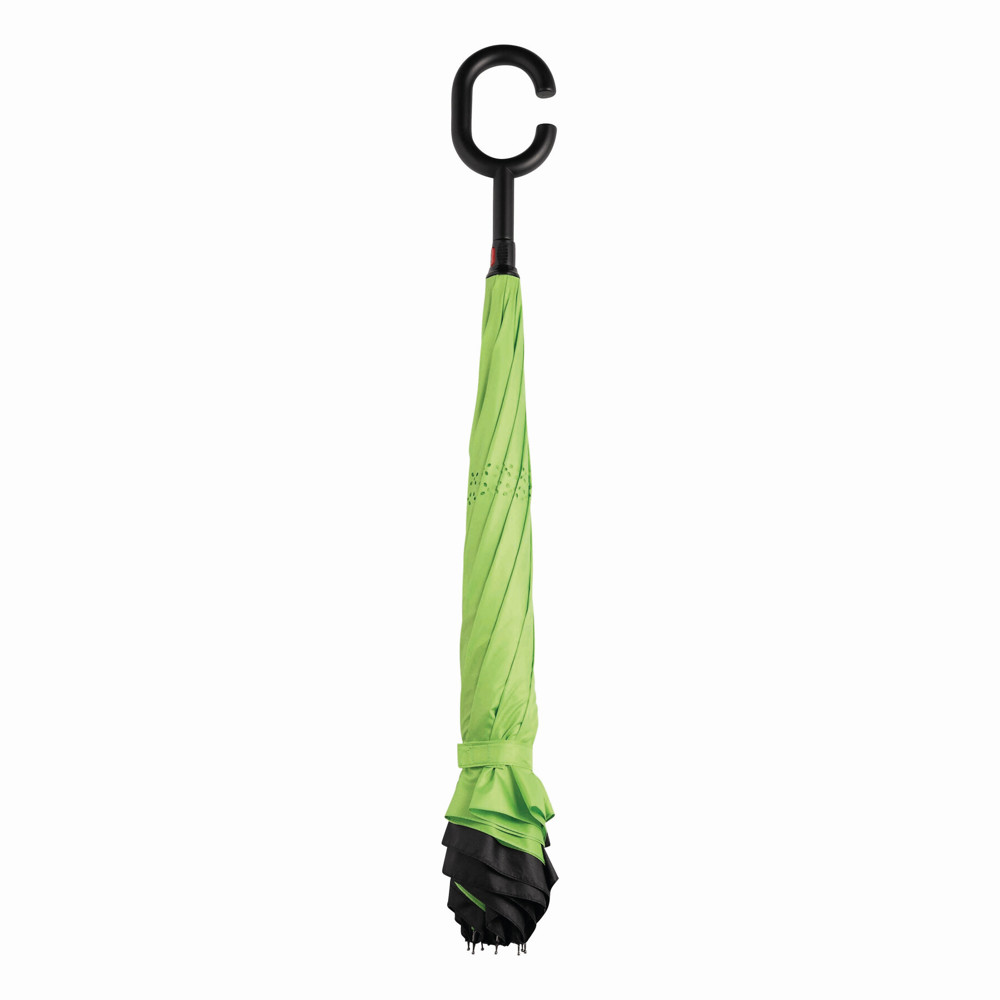 Stockschirm FLIPPED: mit umgekehrtem Öffnungs- und Schließmechanismus, Sicherheitsschieber, freie Hände dank C-Shape-Griff, Doppel-Bezug mit Ventilationsmuster zur Vermeidung von Luftstau, flexibles Gestänge durch Fiberglasspeichen, Metallstock, mit Metalltips, Polyester-Pongee-Bespannung, Schließband mit Klettverschluss