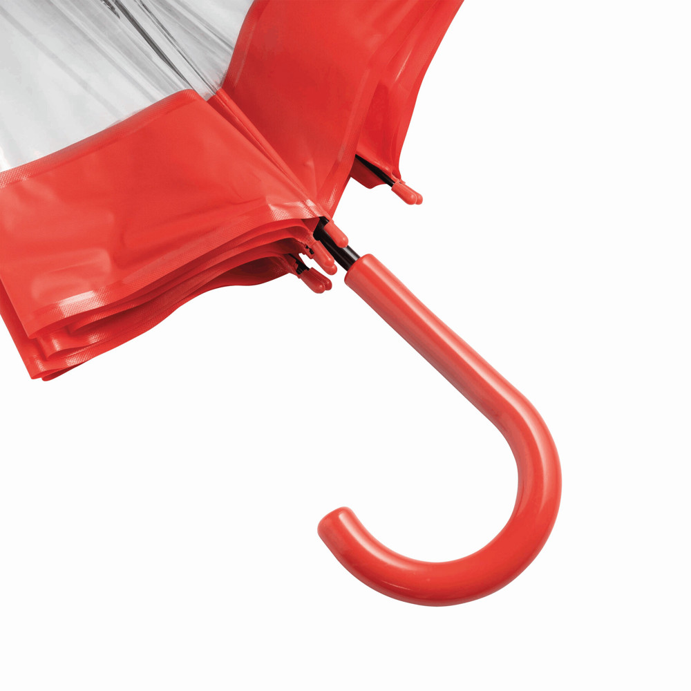 Glockenschirm HONEYMOON: Metallstock und –speichen, Kunststofftips und –spitze, Kunststoffrundhakengriff, transparente POE-Bespannung mit farbiger Bordüre, Schließband mit Druckknopf