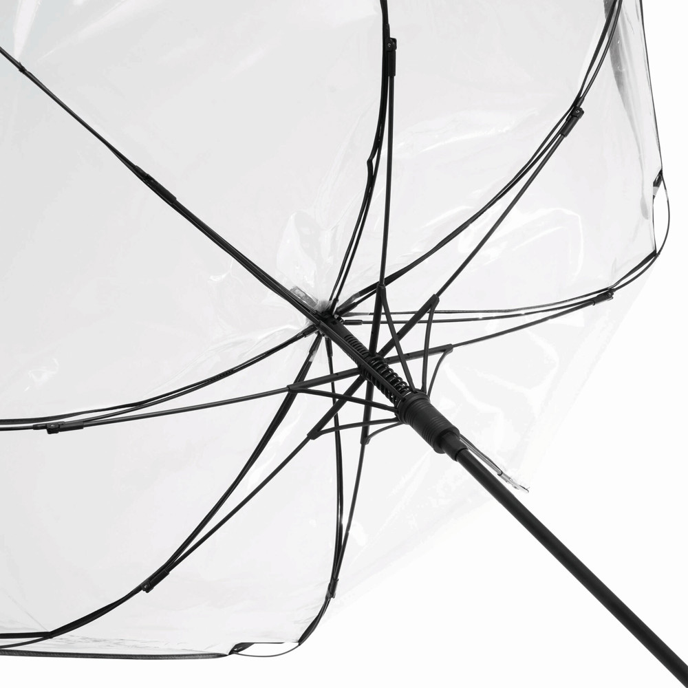 Automatischer Windproof-Stockschirm VIP: Metallstock, farbige Fiberglasspeichen mit Metalltips, Kunststoffspitze, Kunststoffgriff mit integrierter Auslösetaste, transparente POE-Bespannung mit farbiger Paspelierung, Schließband mit Druckknopf