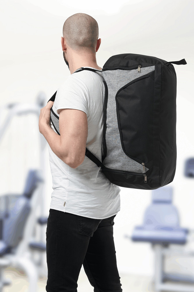 Sporttasche 2 IN 1: geräumiges Reißverschluss-Hauptfach, Reißverschluss-Vortasche, 1 zusätzliche Trageschlaufe, 2 seitliche Reißverschluss-Taschen, verstärkte Tragegriffe, auch als Rucksack einsetzbar